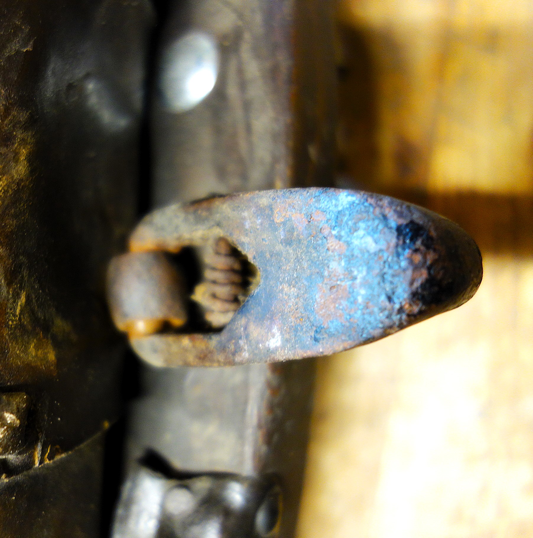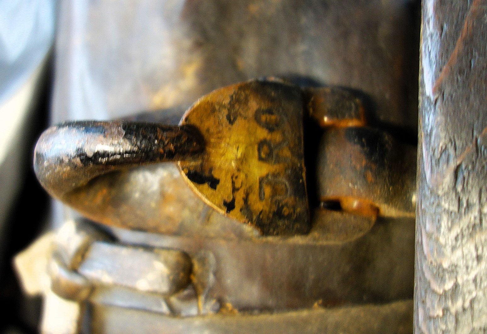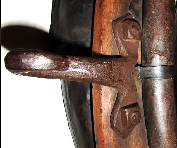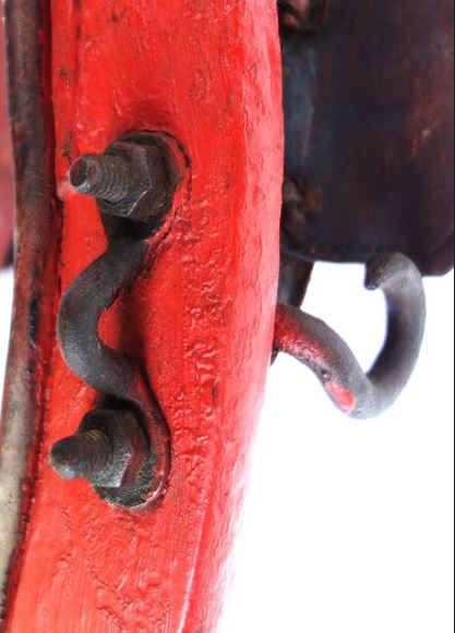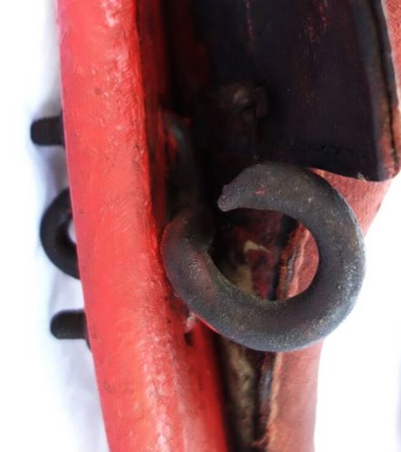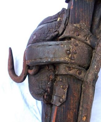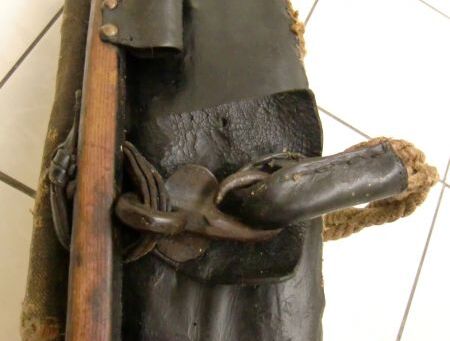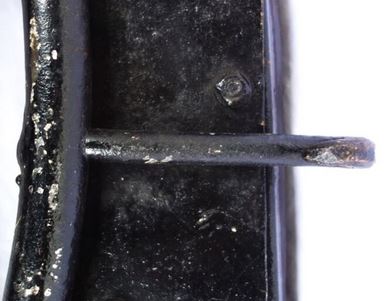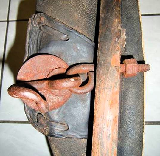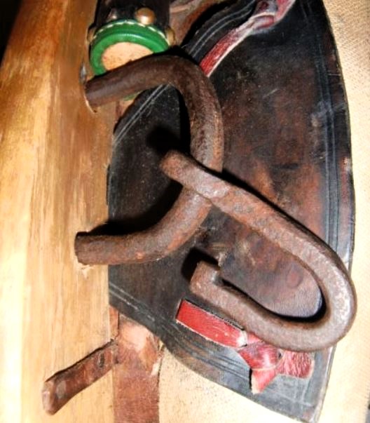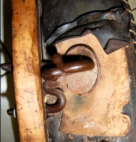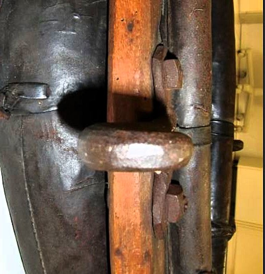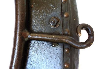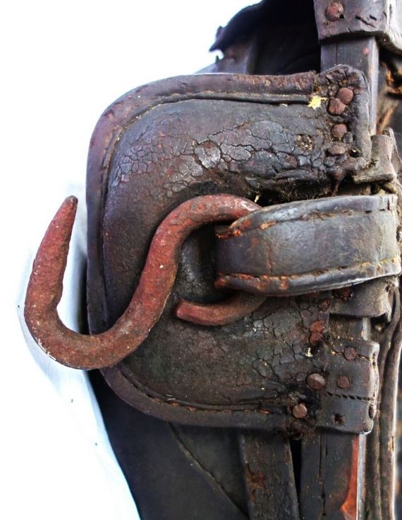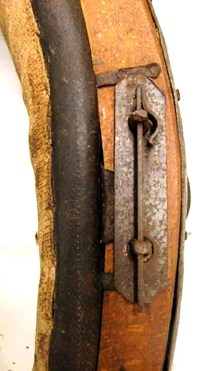 Ein weiteres bewegliches und verstellbares Dreipolsterkumt nach Lang, fast identisch mit dem oberen und viel in Gebrauch gewesen wie die abgenutzten Zughaken und der Verschluß unten zeigen. Auch hier die Polster nicht gleich groß wie die haltenden Metallplatten. Beides wurde schwarz gestrichen. Keine Anzeichen für eine Plakette, die das Teil der "Lang'schen Kummetfabrik" zuordnet. Trotzdem entsprechen die Maße denen vom oben vorgestellten Kumt. Die Verschlußkette unten hat ein Kettenglied mehr, ist also etwa 24cm lang, und wird auch hier rechts eingehakt, der eigentlich falschen Seite für ein einzelnes Tier oder das linke in einem zweier Gespann. Die Zughaken sind unterschiedlich lang, rechts 9cm und links 10,5cm, was die Frage aufwirft ob die beiden Hälften schon immer zusammen gehört haben oder das absichtlich aus ?? Gründen so gemacht wurde. Der obere lederne Verschlußriemen bricht beim ersten Handling in 2 Teile. Von den Kappen für die Rohre ist nur noch die linke vorhanden. Die seitliche Schutzschiene an den Polstern fehlt auf beiden Seiten. Beide Lederriemen zum Rücken- bzw. Schwanzriemen sind abgeschnitten, vermutlich haben sie eine andere Nutzung gefunden. Die Strupfe des Nackenkissens ist nur 23cm lang, das Gegenstück mit der Schnalle wurde unmittelbar am Polster mit einer Niete repariert. Das Nackenpolster selbst besteht aus einem gefalteten Leder, ohne jedes Polstermaterial, 20cm x 8cm. Gewicht: 3,8kg