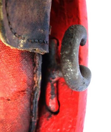 Das folgende Dreipolsterkumt - Paar aus Arnshöfen, Rheinland-Pfalz, fällt durch seine feuerrote Hamenfarbe auf. Dieses modische Detail wurde vor allem von der Sattlerei Völzing in Linden aufgegriffen, was bedeutet daß es auch heute noch viele alte Kumte in dieser Farbe in Hessen gibt. Das Kumt - Paar ist komplett mit Rücken- / Schwanzriemen und Überwurf. Die eigenartigen Zughaken und die Strangflecken sind nicht montiert. So gleich wie es auf den ersten Blick scheint sind weder Kummets noch Geschirre.