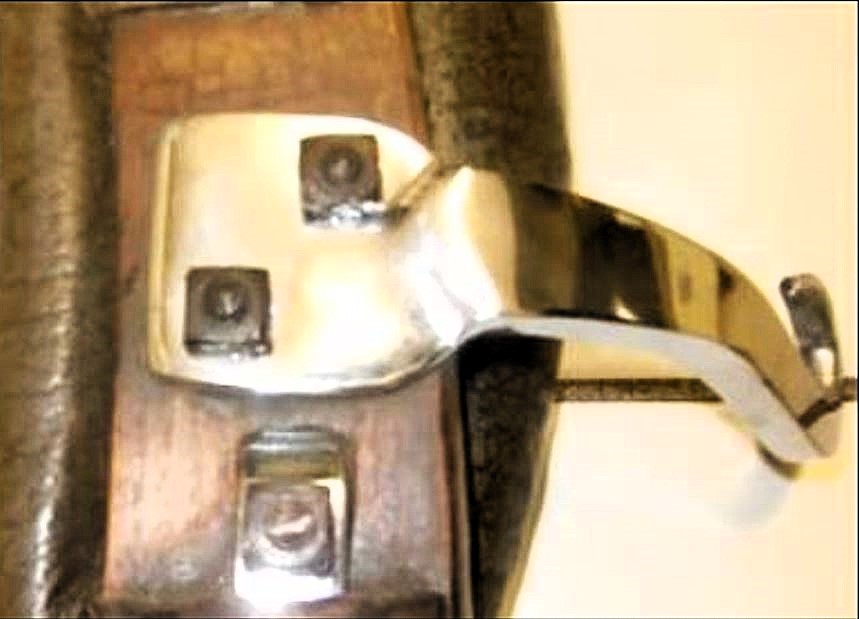 Die Zughaken sind nicht montiert und kommen getrennt mit den ledernen Strangflecken. Letztere sind etwa 11cm lang, an der Hamenseite mit den beiden Löchern für die Zughaken 7cm hoch, an der Außenseite auf den Polstern 11cm hoch und 0,3cm dick. Die Zughaken bestehen aus 4 Teilen und können unterschiedlich zusammengesetzt werden, je nachdem wo sie hingehören und wie eine Lastverteilung gewünscht ist. Das größte Teil wird von hinten durch die passenden Löcher in den Hamen gesteckt und vorn vor 2 entsprechenden Metallplatten als Widerlager mit Sechskantschrauben fest angeschraubt. Dieses Teil bietet 3 Fächer für die eigentlichen Haken. Ein einfach von oben durchzusteckender Stift hält den Haken im gewünschten Fach, dient als Drehachse und wird selbst mit einem kleinen Splint fixiert. Um damit arbeiten zu können müssen die Köpfe aller Stifte oben sein und alle Haken so angebracht, daß sie nach oben offen sind. Durch die exzentrische Lagerung kommt unter Zug automatisch Druck auf die Seitenpolster.