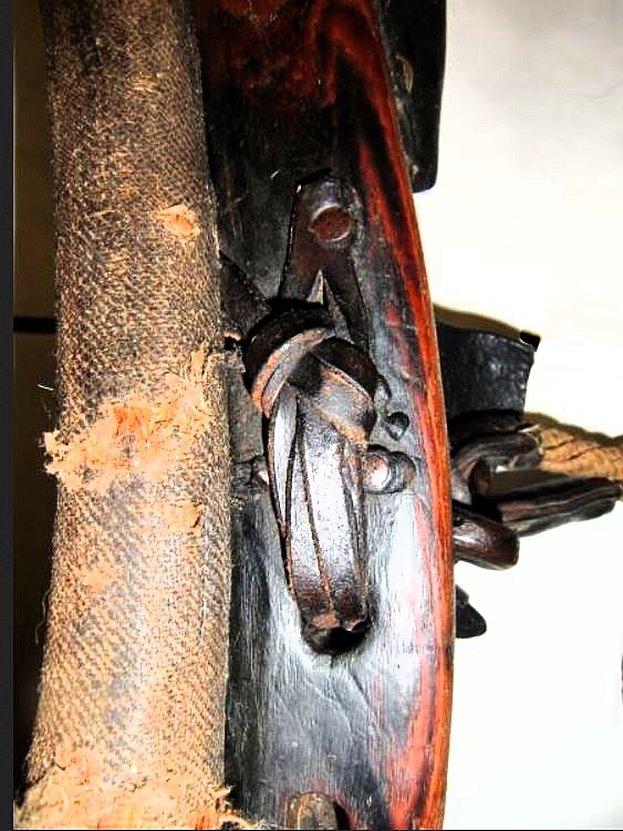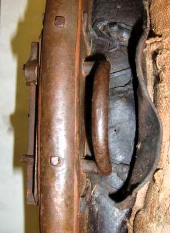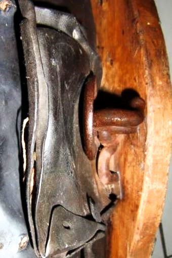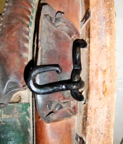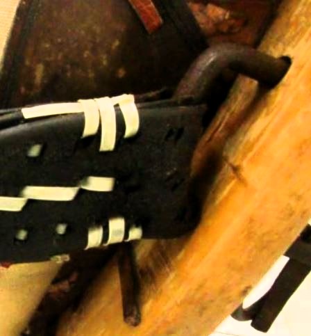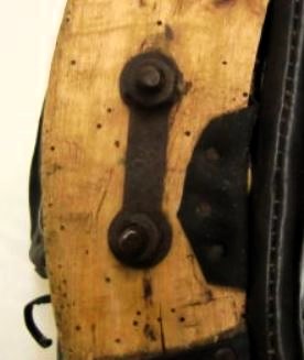 Das Kumt für das rechte Tier ist einfacher gestaltet, naturgemäß fehlt außerdem der Peitschenköcher. Bei gleich hohen Hamen sind diese unterschiedlich dick und breit gestaltet: 7cm breit und der rechte nur 2cm dick. Die etwas größeren Schlitze (3,5cm x 0.7cm) für den Verbindungsriemen sind zumindest auf der linken Seite mehr zum Tier hin gearbeitet. Der geteilte Rückenriemen ist von seinen Dimensionen ähnlich (1,5cm breit, 30cm lang, 0,3cm dick), hier ist die Aufzweigung und der rechte und linke Arm aus einem Stück Leder, was prompt dazu führt, daß der linke an der üblichen Bruchstelle (dem Y) gerissen ist. Von hier bis zur Schnalle für den Schwanzriemen sind es 14cm, wobei die letzten 6cm mit einem passenden Leder aufgedoppelt sind. Der Tragriemen für das hier besser erhaltene Tragpolster ist, wie bei dem anderen Kumt, seitenverkehrt eingebaut, das Schnallende 18cm, die Strupfe 21cm lang. Wie oben beschrieben sitzt das untere Loch des Zughakens auf einer Hamenhöhe von 31cm und die Seitenpolster sind entsprechend 5cm tiefer angebracht. Die Verschlußkette unten ist ebenso seitenverkehrt montiert, der Rest des Kumts ist identisch mit dem oben beschriebenen.