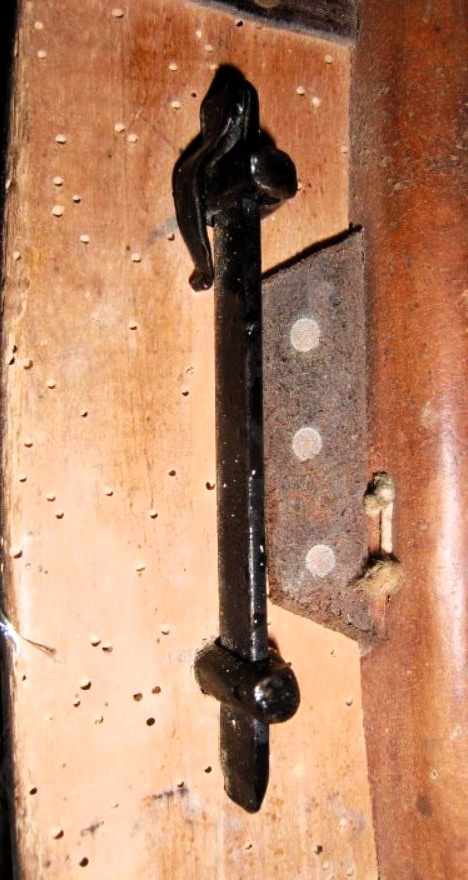Fangen wir mit dem Kumt des linken Tieres an: die Hamen sind 67cm hoch, 5,5cm breit, 2,5cm dick und enden oben als nach außen zeigende Spitzen. Diese sind vorn mit mehreren kleinen (1cm) und einem großen (2cm) Ziernagel beschlagen. Unmittelbar darunter sind die hochovalen Schlitze (3cm x 0,5cm) mittig für den Verbindungsriemen, der leider nicht mehr vorhanden ist. Der Peitschenköcher am linken Hamen (ein Leder von 10cm x 10cm, halbiert, unten zugenäht und mit der Öffnung nach oben am Hamenholz angenagelt) sitzt so nah an dem Durchlass für den Verbindungsriemen, daß er diesen Schlitz unten auf einigen Millimetern verdeckt. Oben halten den Köcher zusätzlich 3 der kleinen Ziernägel. Wiederum unmittelbar darunter anschließend: der vorn angenagelte, sich um die Innenkante des Holzes nach hinten windende Arm des geteilten Rückenriemens, 1,8cm breit, 0,3cm dick und 32cm lang. Damit sind diese Lederteile sehr schmal gehalten; es handelt sich um vorher als Schnallriemen benutzte Strupfen, die jetzt nutzlosen Löcher sind noch sichtbar. Der rechte Riemen ist direkt am Hamen abgerissen. Auf dem Tierrücken werden der rechte und der linke Arm zusammengefaßt durch ein aufgedoppeltes Leder, 2x10cm lang, 4cm breit und 0,5cm dick (auch dieses Stück mit anderer Vornutzung wie 2 Löcher beweisen). Hier findet sich ein "B1" eingestanzt im Leder. Die eingefügte, passende Schnalle dient der Verbindung zum Schwanzriemen. Auf der gleichen Höhe wie der Rückenriemen am Hamen nach innen laufend angenagelt, ist am linken Hamen nach außen ein Leinenführring (5cm, Materialstärke 0,5cm) mit einer kleinen Lederschlaufe (2x5cm, 2cm breit) angebracht. Es ist der einzige an beiden Kumts und wirft die Frage auf, ob hier mit Stoßleine gearbeitet wurde. Wiederum unmittelbar unter dem Ansatz für den gespaltenen Rückenriemen tritt nach vorn zwischen Hamen und Seitenpolster der hinten angenagelte Riemen für das Tragpolster hervor. Ausgeleiert von 1,8cm auf 1,5cm breit zeugt er von der Belastung für die er eigentlich zu schmal ist. Es fällt auf, daß dieser Riemen bei beiden Kumten seitenverkehrt angebracht ist, hier also das Schnallende (16cm lang) links und die Strupfe (22cm lang) rechts. Das Tragpolster aus einer Lederplatte (13,5cm x 7cm) ist am Rand seiner Auflagefläche auf den Hals mit einem Wollstoff vernäht, zwischen dem Leder und diesem Stoff befindet sich eine Lage Filz. Die hinteren Enden des Tragpolsters sind stark aufgebogen, weil die Seitenpolsterspitzen damit interferieren. Die halbmondförmigen Seitenpolster sind bei diesem, linken Kumt 5cm höher angebracht wie bei dem des rechten Tieres. Die mit Stroh gestopften Lederpolster, 40cm hoch, 14cm tief und 7cm dick haben einen mittels Bindegarn und 4cm langen Stichen abgenähten, etwa 3,5cm dicken Wulst. Da die beiden schmalen Befestigungsriemchen (18cm lang, 0,7cm bzw. 1,2cm breit) pro Polster und die Nägel in den Spitzen des Polsters in diesem Wulst sitzen, liegen die Seitenpolster recht weit hinten und selbst von außen kann die Trennnaht zwischen Polster und Wulst gesehen werden. Die Außenfläche der Polster zeigt nicht nur die Abdrücke von Zugstrang und Strangfleck, sondern auch die beiden 0,8cm langen Schlitze, mit denen nur das obere Eck des Strangflecks auf dem Polster mittels Lederbändchen festgeknotet war. Auf etwa 36cm Hamenhöhe ist das untere Loch (1cm Durchmesser) für die Zughaken, 3,5cm darüber das obere. Entsprechend den Polstern befinden sich auch die Zugansätze hier 5cm höher als auf dem Kumt für das Handtier. Der untere Kumtwinkel wird mit einer Kette verschlossen, auch hier seitenverkehrt. Das 2cm breite Eisen das 19cm lang auf der Außenkante des Hamen mit 4 Senkkopfschrauben befestigt ist und am Ende 2 Aufzüge gegen ein Verrutschen hat läuft in einen 3cm langen Haken aus, hier links geschlossen und mit Kette (6 Kettenglieder à 4cm), rechts offen zum Einhaken.