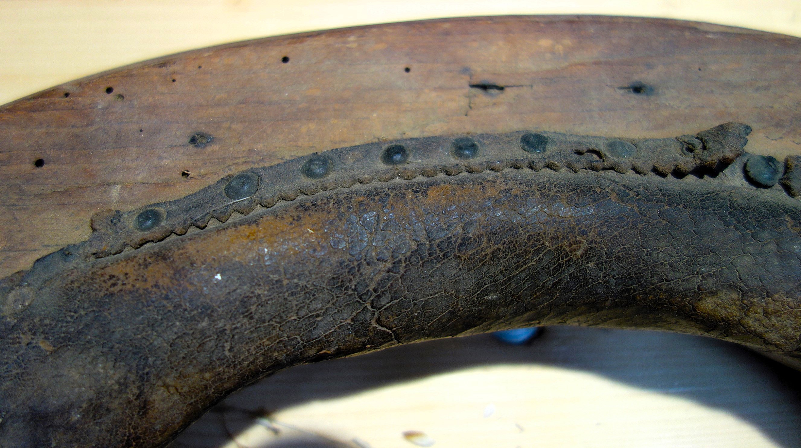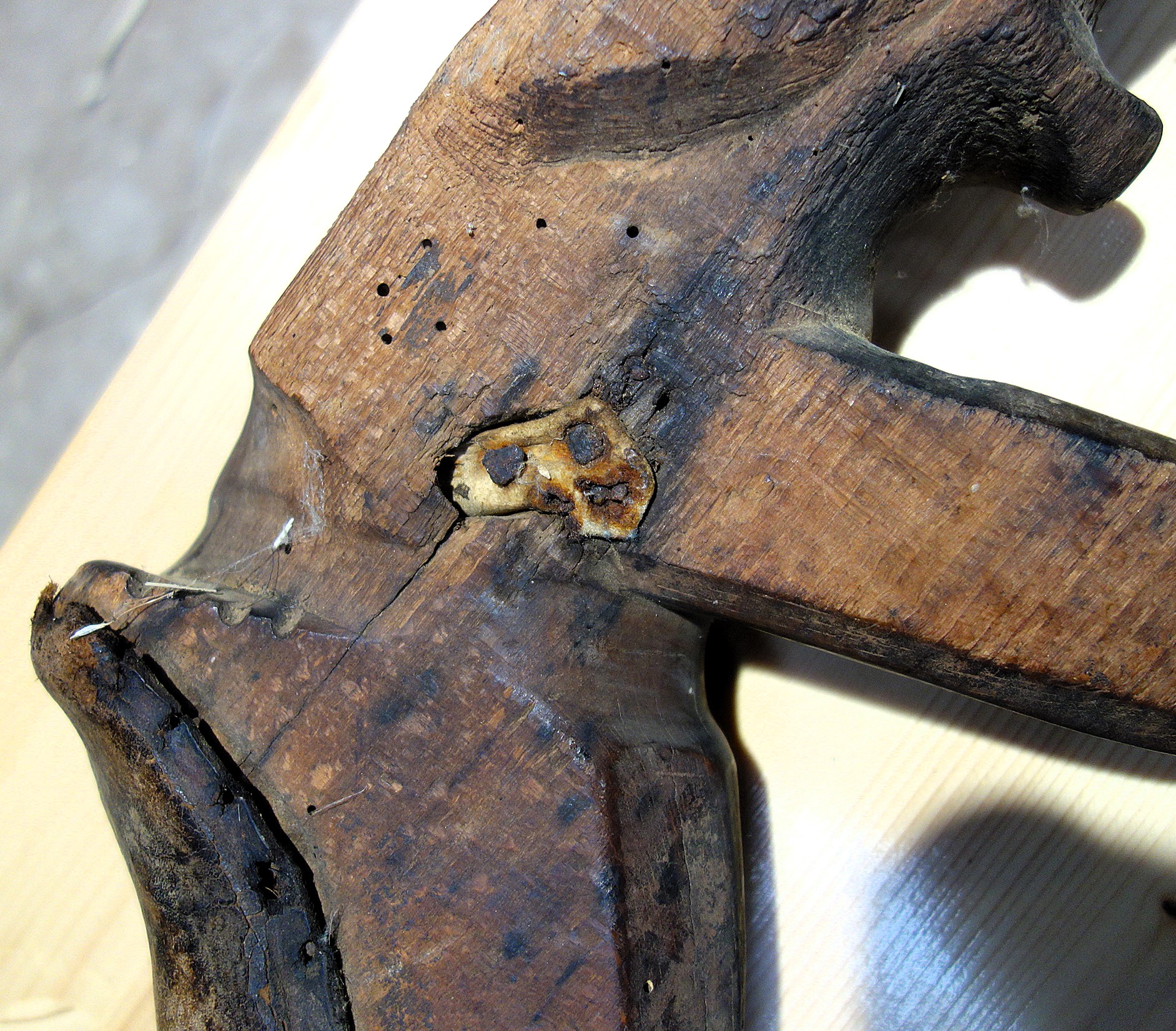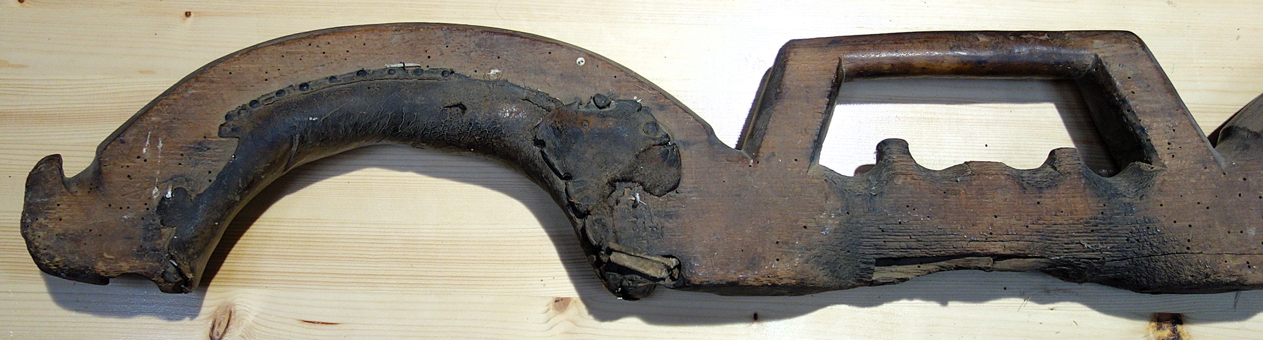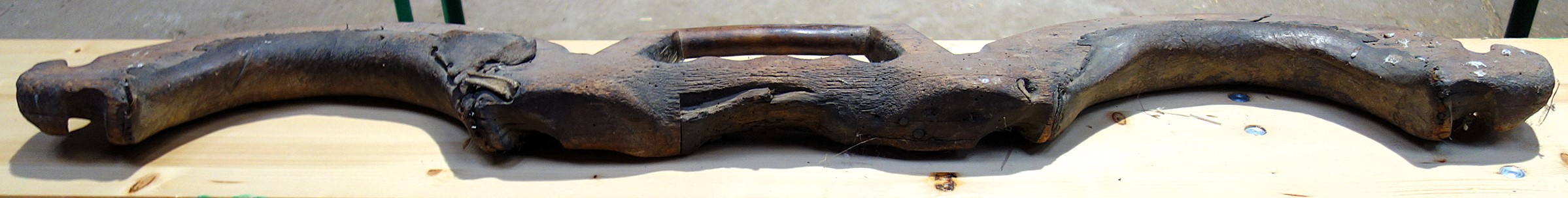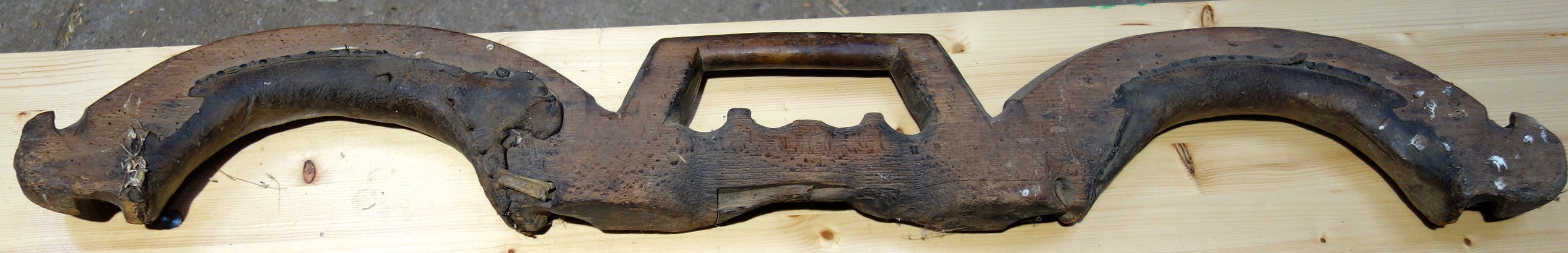 Das folgende Genickdoppeljoch stammt aus Hannover. Es ist aus einem Stück gefertigt, 118cm breit (ca. 4cm sind rechts abgefault), 15cm hoch und 8cm dick. Die lichte Weite der Genickauflagen beträgt 26cm und die lichte Höhe 8cm. Es wurden offensichtlich zwei unterschiedliche Ankopplungen für die Last verwendet. Noch vorhanden ist eine Leder-Eisen Wid durch eine Öffnung im Jochholz mittig befestigt. Das handgeschmiedete Eisen-U (Eisenstärke 1cm x 1cm; 10cm breit und 12cm hoch) hat an jedem Ende ein Loch von 2,5cm Durchmesser in denen ein runder Holzpflock für die Verbindung zur Lederschlaufe sorgt. Das Leder liegt 5-fach gewickelt, 4cm breit und 0,4cm dick, mit sich selbst verknotet um den Pflock und durch das passende Loch (8cm x 3cm) im Jochbaum. Deutliche Abnutzungsspuren zeugen von einer weiteren Lastaufnahme um den ganzen Jochbaum. Ein Lederflicken ist im Bereich des rechten Horns des linken Tieres angenagelt; reine Vermutung: um eine bessere Passform und damit bessere Fixierung des Jochs zu erreichen? Um das darunterliegende eiserne Ende des massiven Eisennagels vom Drücken abzuhalten? Hinten nämlich, neben der Genickauflage, befindet sich zur Mitte hin je ein Nagel (1cm dick, 8cm lang), der durch das gesamte Jochholz reicht. Dort wurde mit einem Halbstek der Befestigungsriemen verknotet. Gewicht: 4,85kg
