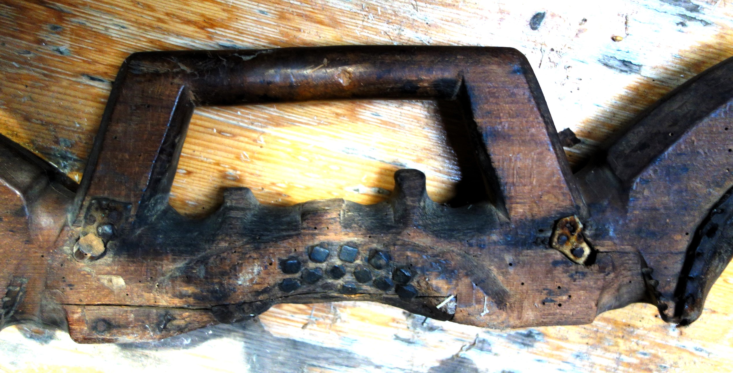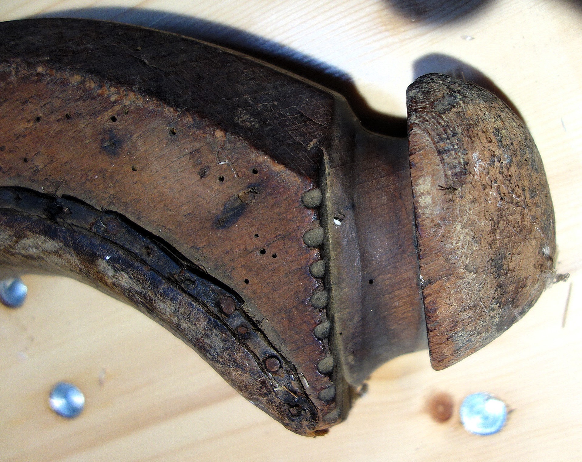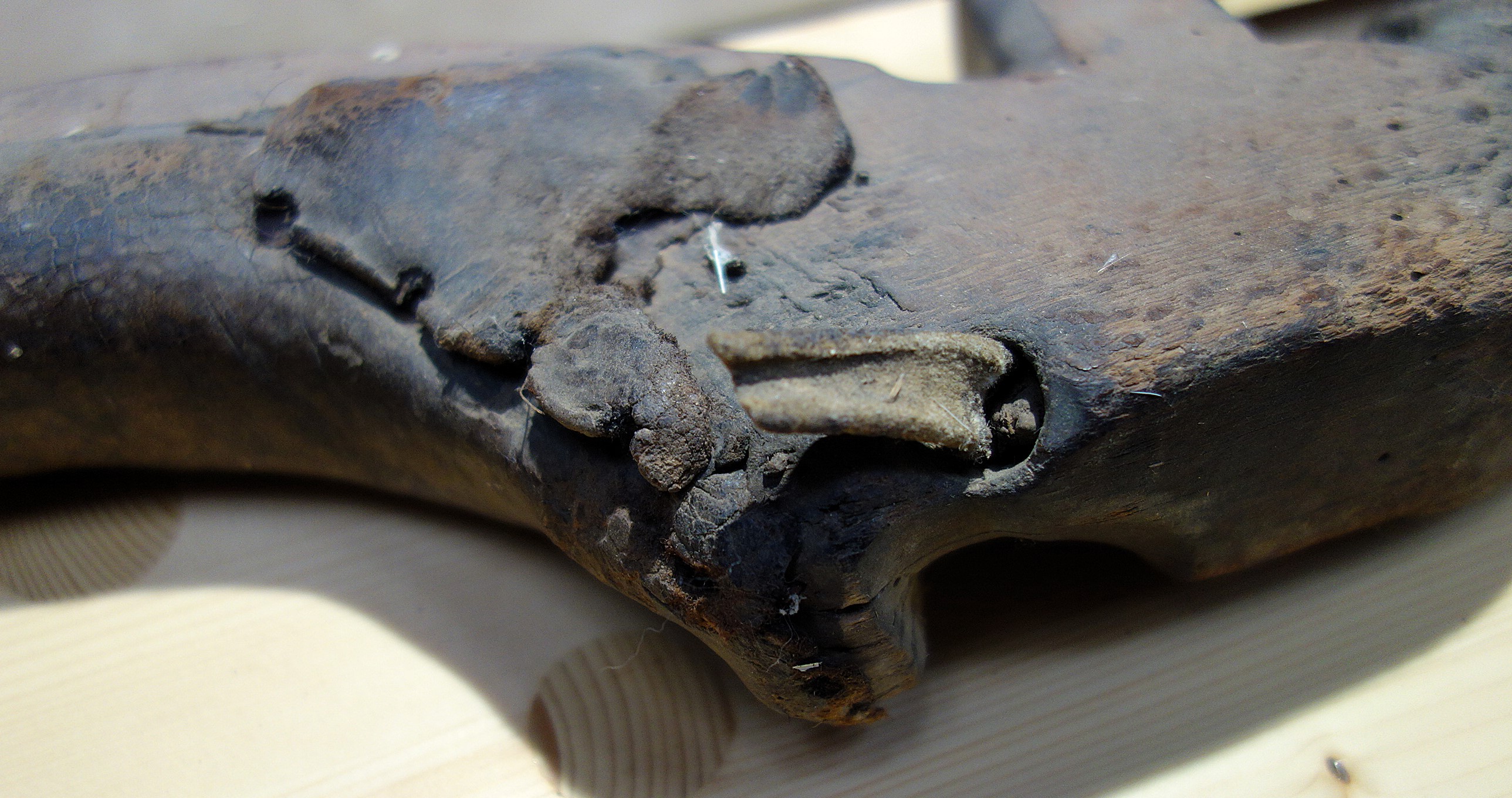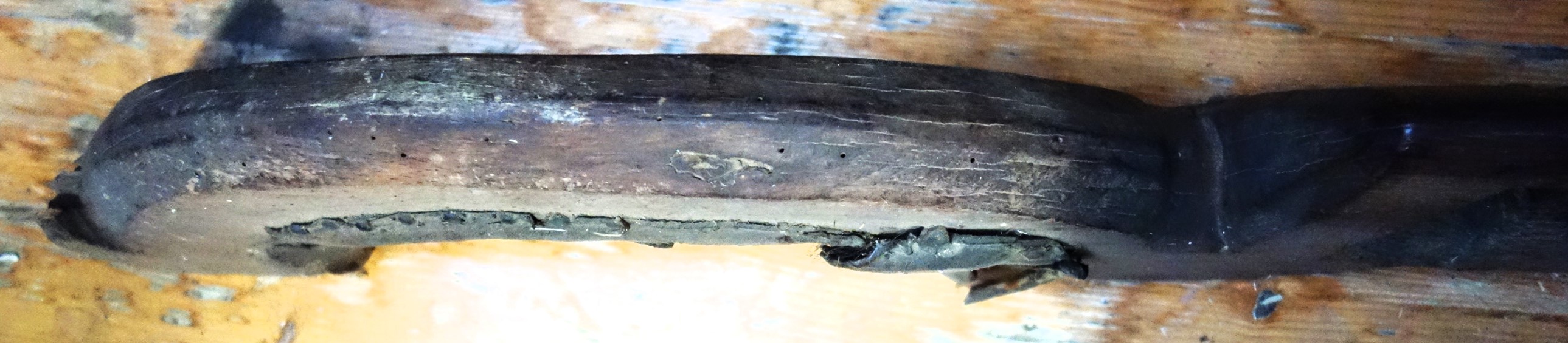 Das folgende Genickdoppeljoch stammt aus Hannover. Es ist aus einem Stück gefertigt, 118cm breit (ca. 4cm sind rechts abgefault), 15cm hoch und 8cm dick. Die lichte Weite der Genickauflagen beträgt 26cm und die lichte Höhe 8cm. Es wurden offensichtlich zwei unterschiedliche Ankopplungen für die Last verwendet. Noch vorhanden ist eine Leder-Eisen Wid durch eine Öffnung im Jochholz mittig befestigt. Das handgeschmiedete Eisen-U (Eisenstärke 1cm x 1cm; 10cm breit und 12cm hoch) hat an jedem Ende ein Loch von 2,5cm Durchmesser in denen ein runder Holzpflock für die Verbindung zur Lederschlaufe sorgt. Das Leder liegt 5-fach gewickelt, 4cm breit und 0,4cm dick, mit sich selbst verknotet um den Pflock und durch das passende Loch (8cm x 3cm) im Jochbaum. Deutliche Abnutzungsspuren zeugen von einer weiteren Lastaufnahme um den ganzen Jochbaum. Ein Lederflicken ist im Bereich des rechten Horns des linken Tieres angenagelt; reine Vermutung: um eine bessere Passform und damit bessere Fixierung des Jochs zu erreichen? Um das darunterliegende eiserne Ende des massiven Eisennagels vom Drücken abzuhalten? Hinten nämlich, neben der Genickauflage, befindet sich zur Mitte hin je ein Nagel (1cm dick, 8cm lang), der durch das gesamte Jochholz reicht. Dort wurde mit einem Halbstek der Befestigungsriemen verknotet. Gewicht: 4,85kg