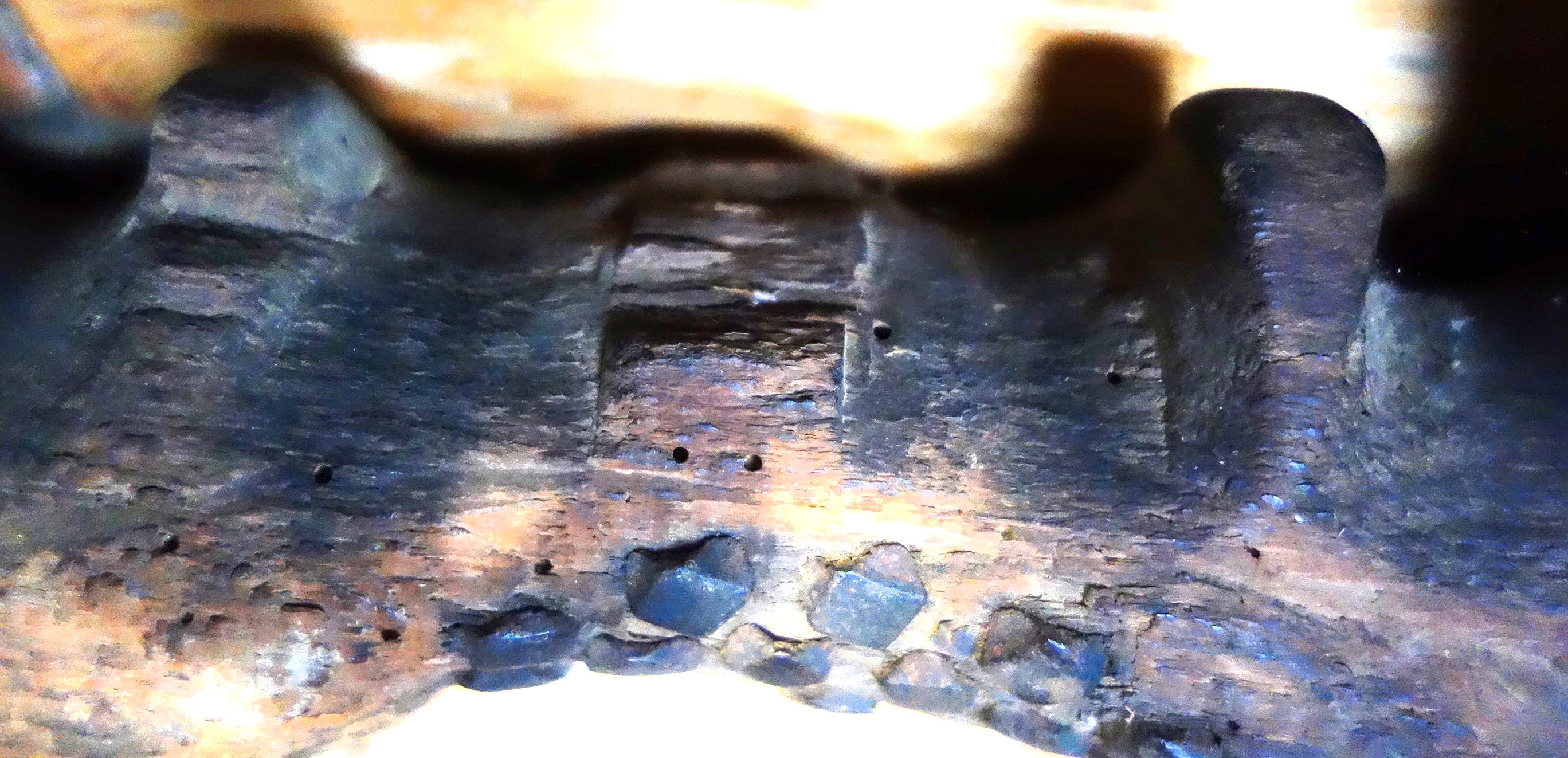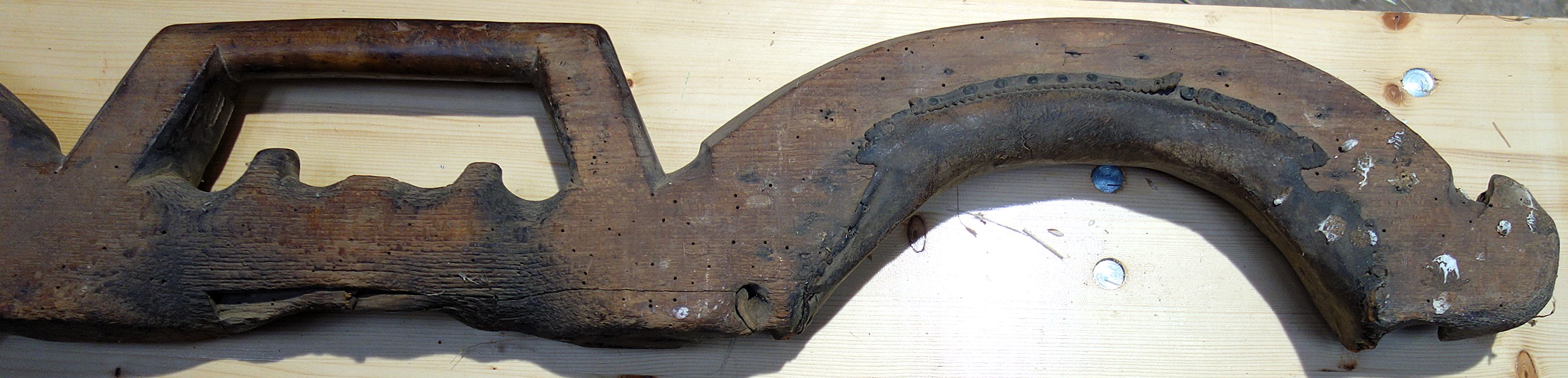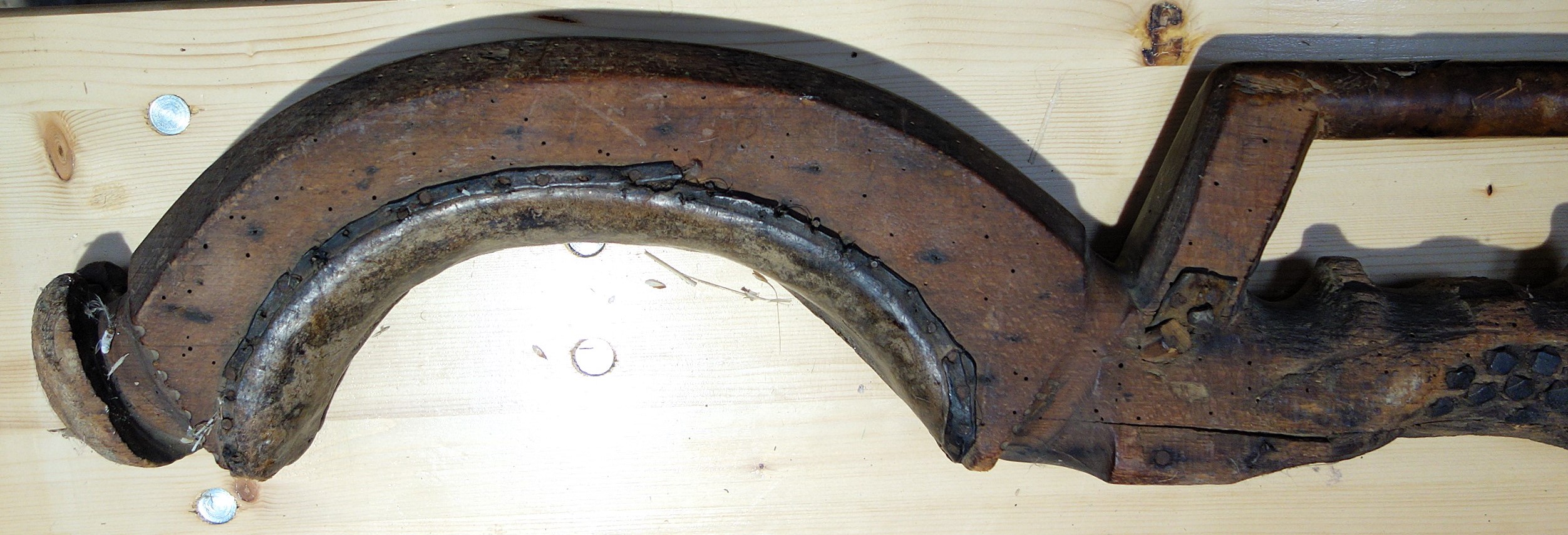 Das unten abgebildete, aus einem Stück geschnitzte, Genickdoppeljoch ist ein Schalenjoch. Der Jochbaum ist ca. 117cm breit, 14cm hoch und zwischen 10cm an den Schalen und 3cm an seinen Enden tief. Die 45cm voneinander entfernten Schalen haben eine lichte Weite von 28cm und eine lichte Höhe von hinten 12cm bzw. vorn 8cm. Der rechten Genickauflage wurden am äußeren Rand etwa 7cm entfernt und dann eine gut 2cm breite Rinne für den Befestigungsriemen angelegt. Sonst wäre dieser Riemen außerhalb dieser Auflage verlaufen, auch da finden sich Abnutzungsspuren. Weiter fällt auf, daß der äußere Rand der Schalen nicht so weit herunterreicht wie der zur Mitte hin und daß die Schalen selbst außen nur 5cm aus dem Jochbaum hervorragen, während es mittig 6cm sind. Der obere Rand der Schalen und der etwa 3cm breite Bereich des Jochbaums vorn, der sich über alles erstreckt, sind mit Kerbschnitzerei in verschiedenen Motiven verziert. Im rechten Ende des Jochholzes findet sich ein 2cm großes rundes Loch. Zur Mitte gelegen und unmittelbar an die Schale anschließend ein ovales 4cm x 1,5cm Loch, horizontal nach vorn, durch welches der Befestigungsriemen beim Schnüren geschoben wurde. Noch weiter zur Mitte gelegen ein etwa 2cm rundes Loch das schräg nach unten und außen bzw. vorn verläuft und unmittelbar an der Kante Vorderfläche / Boden aus dem Jochholz wieder austritt. Hier mündet der Anfang des Befestigungsriemen in unmittelbarer Hornnähe. In der Mitte selbst ist das Widloch /der Griff herausgearbeitet, 17cm breit und ca. 5cm hoch. Das eigentlich sehr fein gearbeitete Joch wirkt hier am Boden dieses Widlochs grob zurechtgestutzt, es ist 3teilig mit einem rechten Abteil von 5cm Breite, einem mittleren, etwas erhöhtem, von 6cm und einem linken ebenfalls mit 6cm Breite. Ob Ketten als Wid benutzt wurden? Zumindest sind tiefe Gebrauchsspuren auch im aufgenagelten Schutzeisen zu erkennen. Weiter diverse Nägel und Schrauben deren Zweck sich nicht erschließt. Hinten ist das Schutzeisen an den Enden mit grob ausgeschmiedeten Flügeln versehen, von denen der links unten abgebrochen ist. Das Eisen ist 36cm breit, zwischen 3cm und 5cm hoch und 0,4cm dick. Der Jochboden ist mit einem Eisen aus der selben Machart (23cm x 6cm) geschützt. Vorn ist die Eisenfläche naturgemäß kleiner (20cm x 5,5cm), es muß Platz bleiben für die Hörner. Hier die erwähnten tiefen Kerben und Rinnen im Eisen. Alle Schutzeisen sind mit Hufnägeln am Jochholz befestigt und ein Vorbesitzer hat sie mit Goldbronze "aufgehübscht". Gewicht: 4,35kg
