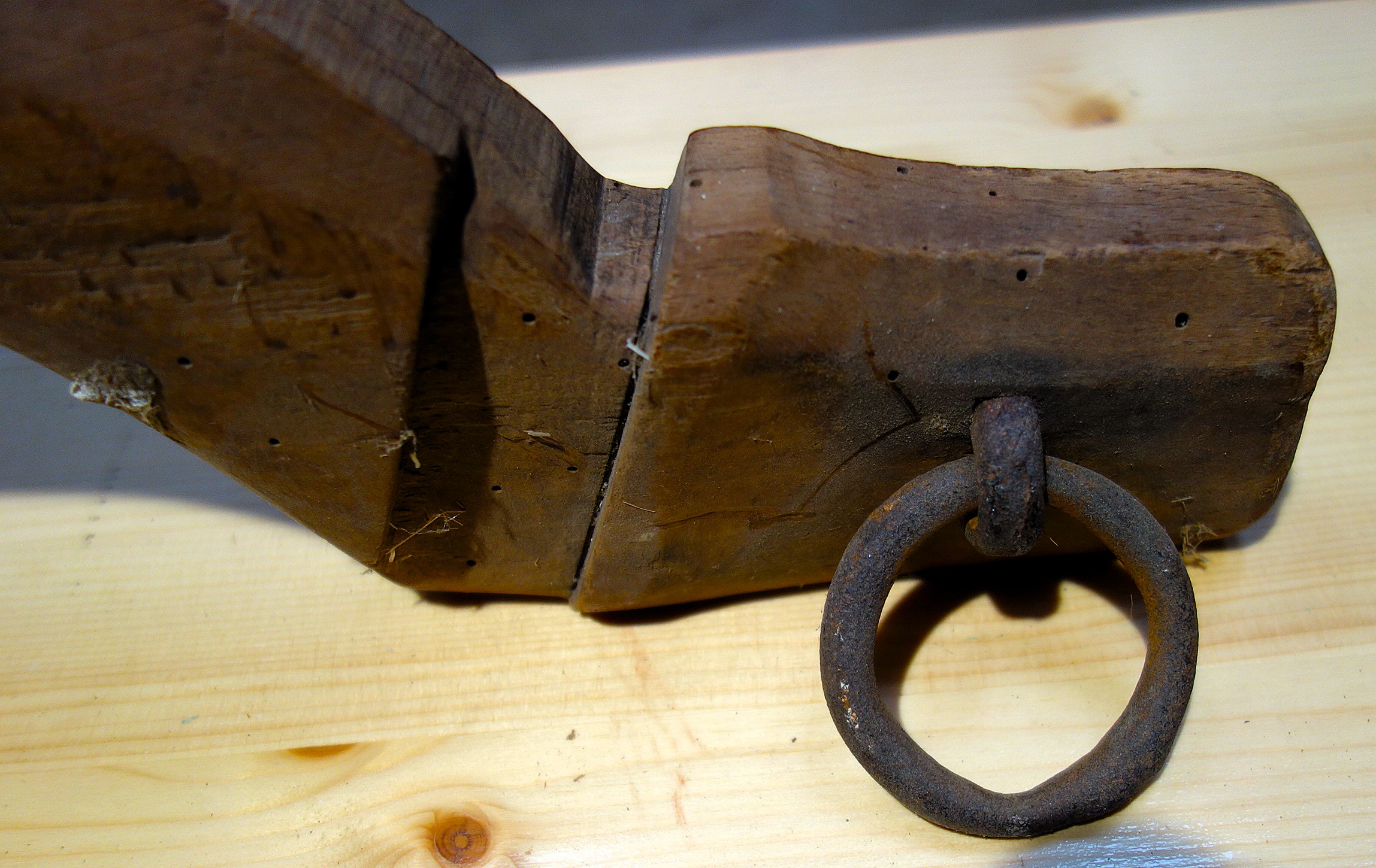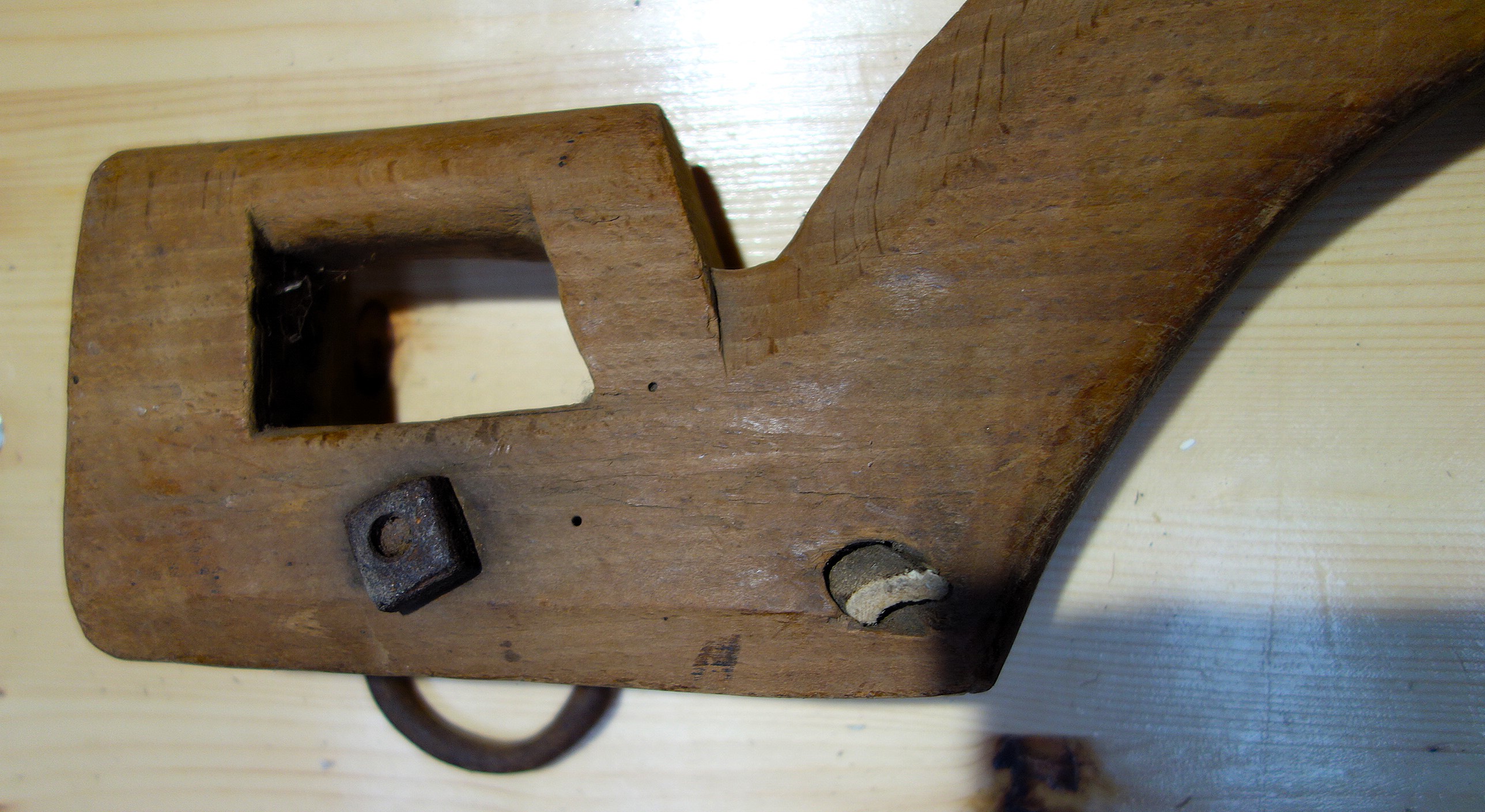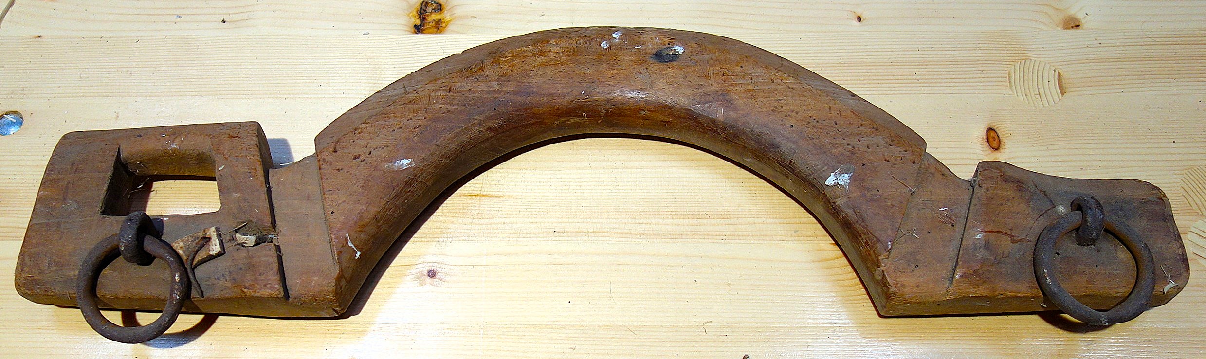 Das folgende Genickeinzeljoch (ein Schalenjoch) kann nur unbestimmt Frankreich zugeordnet werden. Herr Desrosières hat es auf dem Trödel in Paris erstanden. Wir wären dankbar für weitere Informationen zu diesem gut erhaltenen Stück. Vorn sieht man deutlich die Vertiefungen für die Hörner, mit dem Nagel oben wurde der lange Riemen zum Befestigen des Jochs fixiert und an den Seiten angebrachte eiserne Haken lassen vor allem eine Verwendung mit Zugseilen/-ketten als wahrscheinlich vermuten.