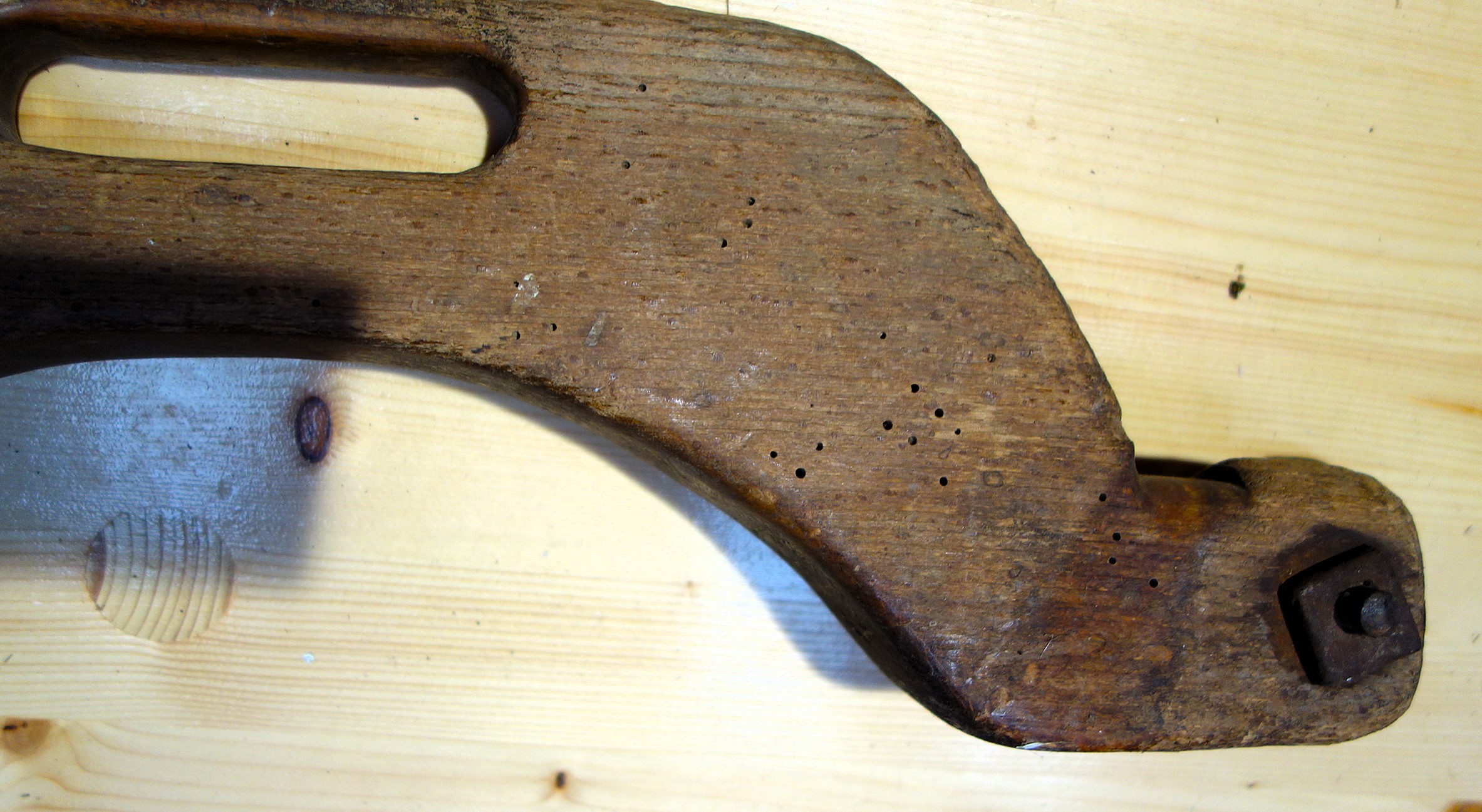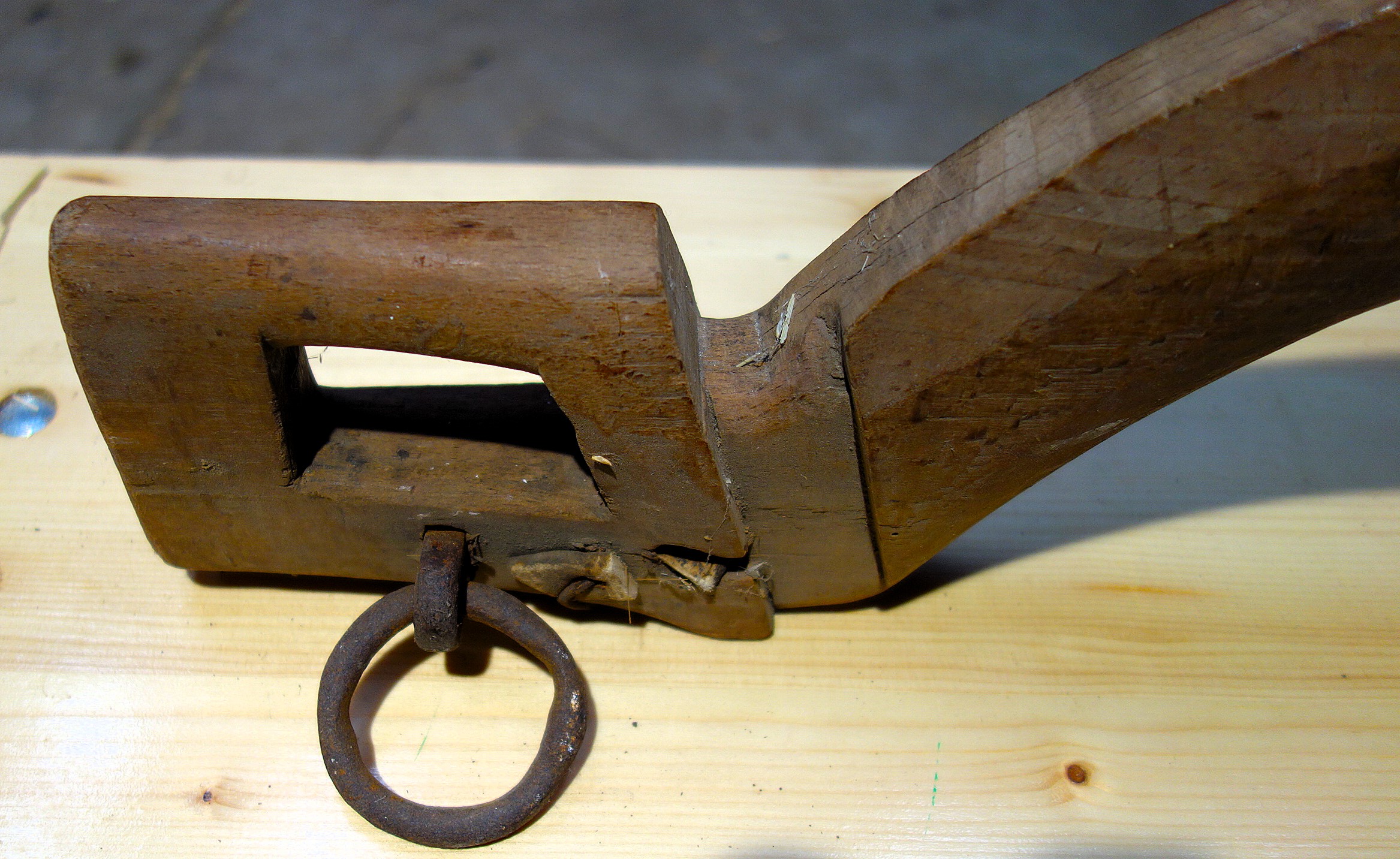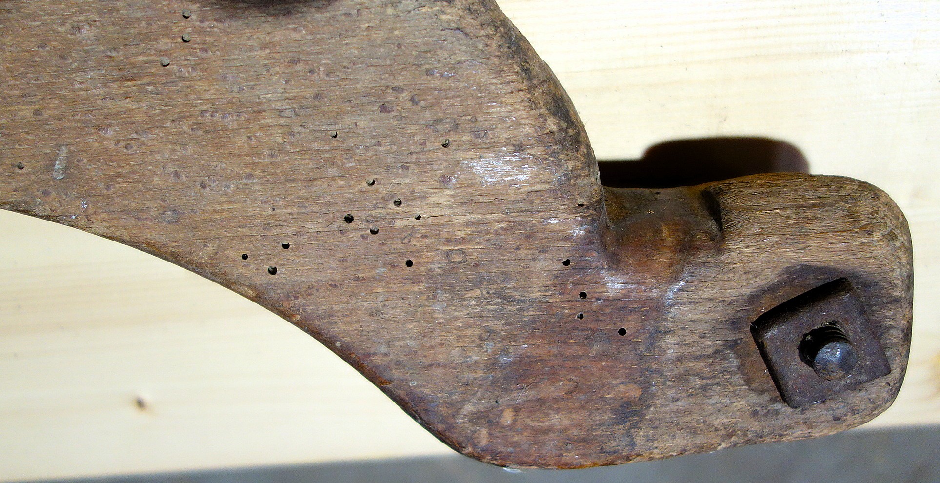 Das folgende Genickeinzeljoch (ein Schalenjoch) kann nur unbestimmt Frankreich zugeordnet werden. Herr Desrosières hat es auf dem Trödel in Paris erstanden. Wir wären dankbar für weitere Informationen zu diesem gut erhaltenen Stück. Vorn sieht man deutlich die Vertiefungen für die Hörner, mit dem Nagel oben wurde der lange Riemen zum Befestigen des Jochs fixiert und an den Seiten angebrachte eiserne Haken lassen vor allem eine Verwendung mit Zugseilen/-ketten als wahrscheinlich vermuten.