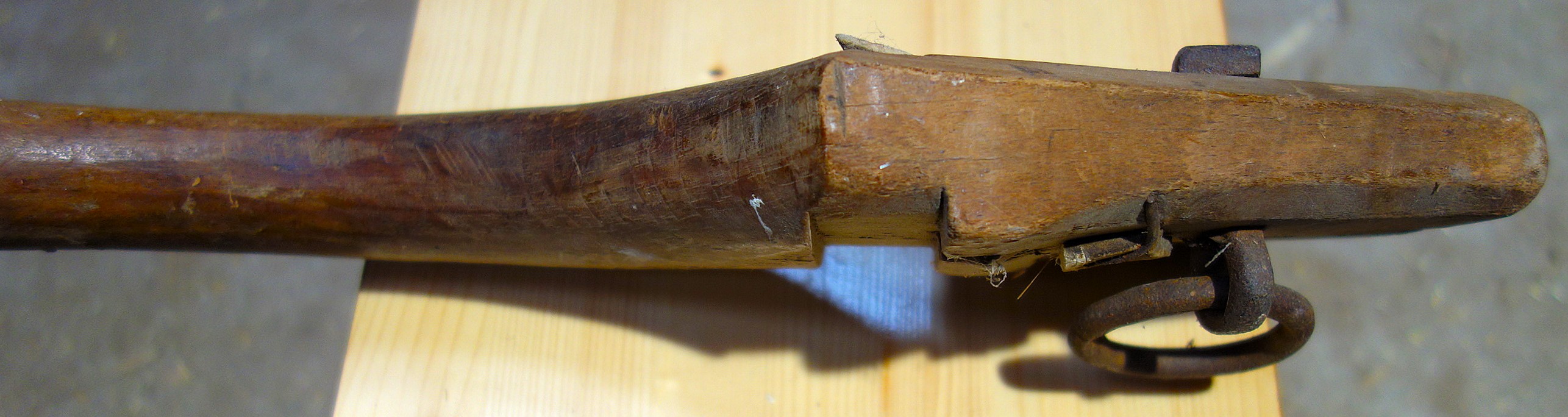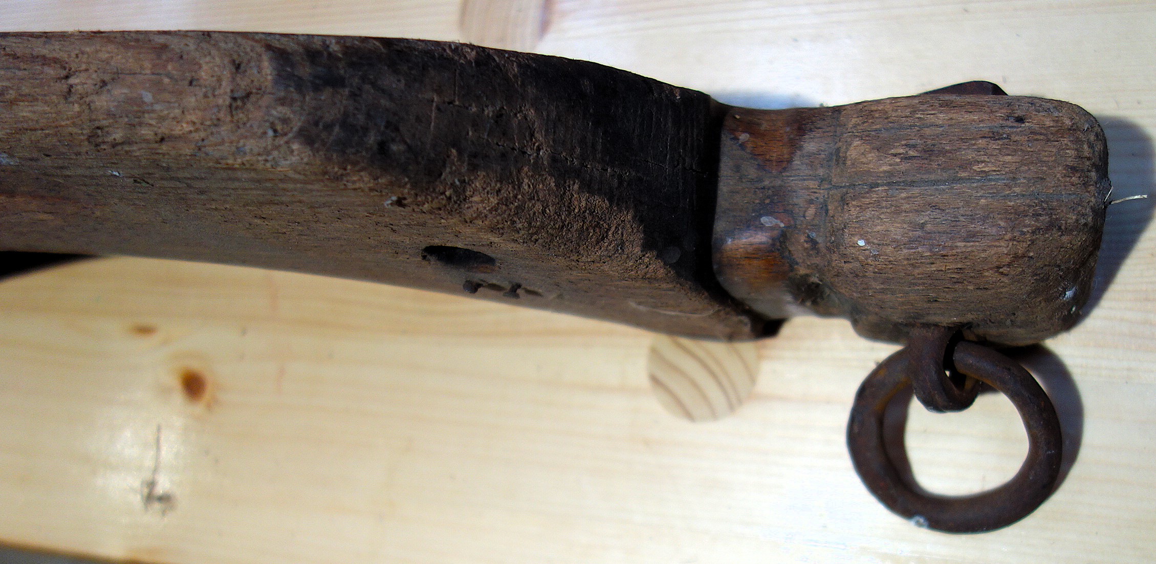 Das folgende Genickeinzeljoch aus Unterfranken wurde von einem Vorbesitzer mit hochglänzendem Lack "verschönert". Es ist 49cm breit, 13cm hoch und 5cm dick. Die deutliche Assymetrie zwischen vorn (glatt) und hinten (gerundet und mit Ausschnitten für das Befestigungsleder) fällt sofort ins Auge. Nicht auf den ersten Blick erkennbar, trotzdem gerade noch sichtbar an diesem vielbenutzen Holz: feine Kerbschnitzerei einmal oben entlang der Vorderkante des Bogens / Handgriffs im Abstand von 1cm parallel und weiterhin an den hervorstehenden Kanten beidseits der Rinnen in denen das Befestigungsleder verläuft. Dort sind zum Genick hin eine Linie Punkte an der Kante, gleiches zum Ohr hin, jeweils innen und außen auf der Kante des geschnitzten Vorsprungs. Die Auflage für das Genick hat eine lichte Höhe von 7cm, eine Weite von 23cm. Der Bogen trägt an seiner höchsten Stelle 2 waagrechte Löcher (3cm x 1,5cm) die als Handgriff dienen. Zum besseren Greifen wurde der hintere Bereich des Holzes hier bis auf 2cm für den Griff entfernt und so hat man eine ebene Plattform. Die Vertiefungen für den Lederriemen, der das Teil an den Hörnern fixiert, sind 26cm voneinander entfernt, 2cm breit und bis zu 1cm tief. Auf der rechten Seite erkennt man den Holzpflock der ursprünglich den Anfang des Lederriemens im Genickjoch fixiert hat. Er wurde von hinten mit dem Leder eingeschlagen und durch den beim Gebrauch entstehenden Zug vorn erst recht gehalten. Das Loch für diesen Dübel läuft schräg durch das Holz, hinten weiter innen und oben als vorn, wo es praktisch unmittelbar neben dem Rinnenbereich austritt. Die eisernen Ösen für die Zugabnahme sind 43cm voneinander entfernt. Sie sind aus 1cm dickem Eisen geschmiedet, werden dann mit beiden Enden nach vorn durch ein Loch in den Seiten des Jochs gesteckt um dort umgebogen zu werden, ein Ende nach oben, eines nach unten bis fast wieder ganz auf die Hinterseite. Das verankert diese der Belastung ausgesetzten Teile nicht nur hervorragend sondern verhindert außerdem ein Aufspalten des Holzes. Rechts befindet sich in der Öse ein nach oben offener, eiserner Zughaken (6,5cm) mit Knopf an seiner Spitze, links außer einem größeren Haken (8,5cm) auch noch ein eiserner Ring (4cm). Gewicht: 1,1kg