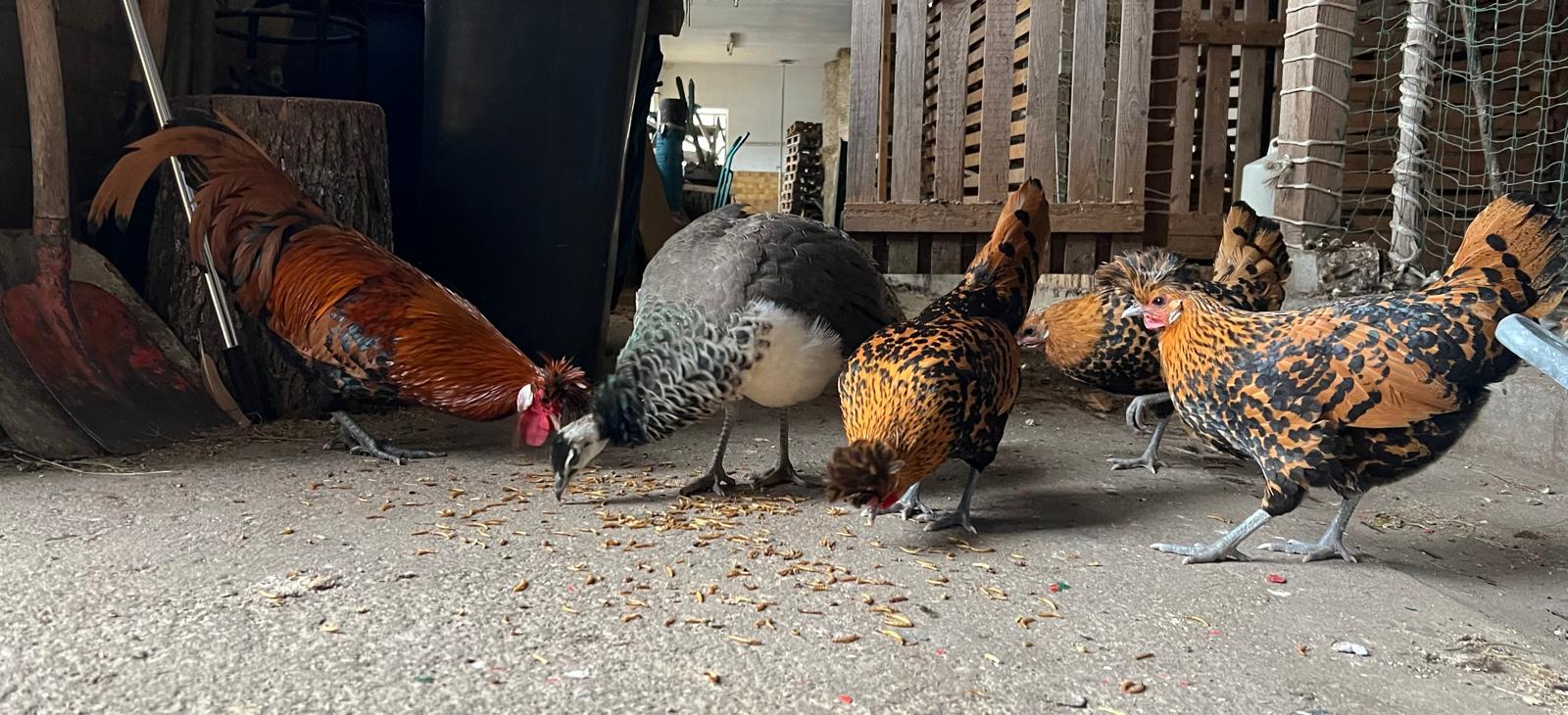 Überraschend schnell werden sie erwachsen. Bei uns mehrt sich das Staunen als sich 3 prachtvolle Hähne herausschälen, also haben wir 8 Hennen. Dann finden wir das erste Ei. Ich bring's den Nachbarn, denn die hatten plötzlich Hühner im Garten, auf der Veranda, vorm Hauseingang. Gott sei Dank sind sie geduldig und freuen sich, genauso wie wir, der Entwicklung der Gruppe zuzusehen. Dann gibt es immer mehr Eier. Wir haben Ostern, das ganze Jahr! Eiersuche überall! Kaum ist ein Nest angelegt, schon ist es nicht mehr gefragt. Eier finden sich im Heuballen, der zum Hufschmied geliefert wurde und im Stroh für die Rinder, Eier finden sich im Futterbarren und draußen unter der Treppe, Eier finden sich im Schubkarren mit den Holzspänen und sogar da wo sie hingehört hätten: in den Nestern im alten Küchenschrank. Manche Eier finden sich gar nicht.