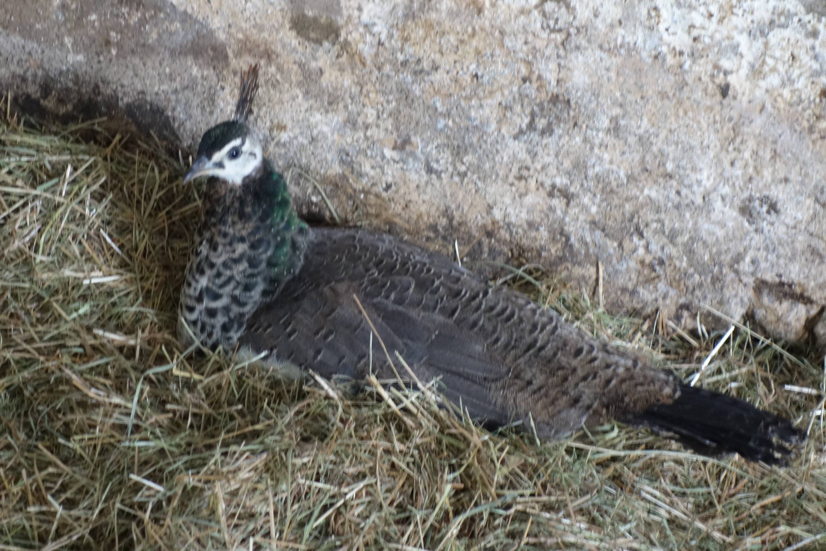 Neues Jahr, neues Glück? Wieder sitzen unsere beiden Hennen über- und nebeneinander in einem Nest und brüten. Sie werden dieses Jahr die einzigen sein, dafür aber ausgiebig. Nach 8 Wochen zeigt sich kein Nachlassen der Brutaktivität, dafür unserer Geduld. Das eigene Gelege hatten wir durch 2 Pfaueneier ersetzt, die eigentlich 1 Woche länger als Hühnereier brauchen. Aber nach der 5. Woche Pfaueneier bebrüten war außer Schalen, klebrigem Inhalt und pappigem Heu nichts im Nest außer - wieder neugelegte Hühnereier. Wir konnten ein frisch geschlüpftes Pfauenkücken ergattern und schoben es unter. Sofort wandelte sich das Verhalten unserer beiden Damen. Ein doppeltes Glucken rief das Kücken von nun an zur Raison.