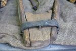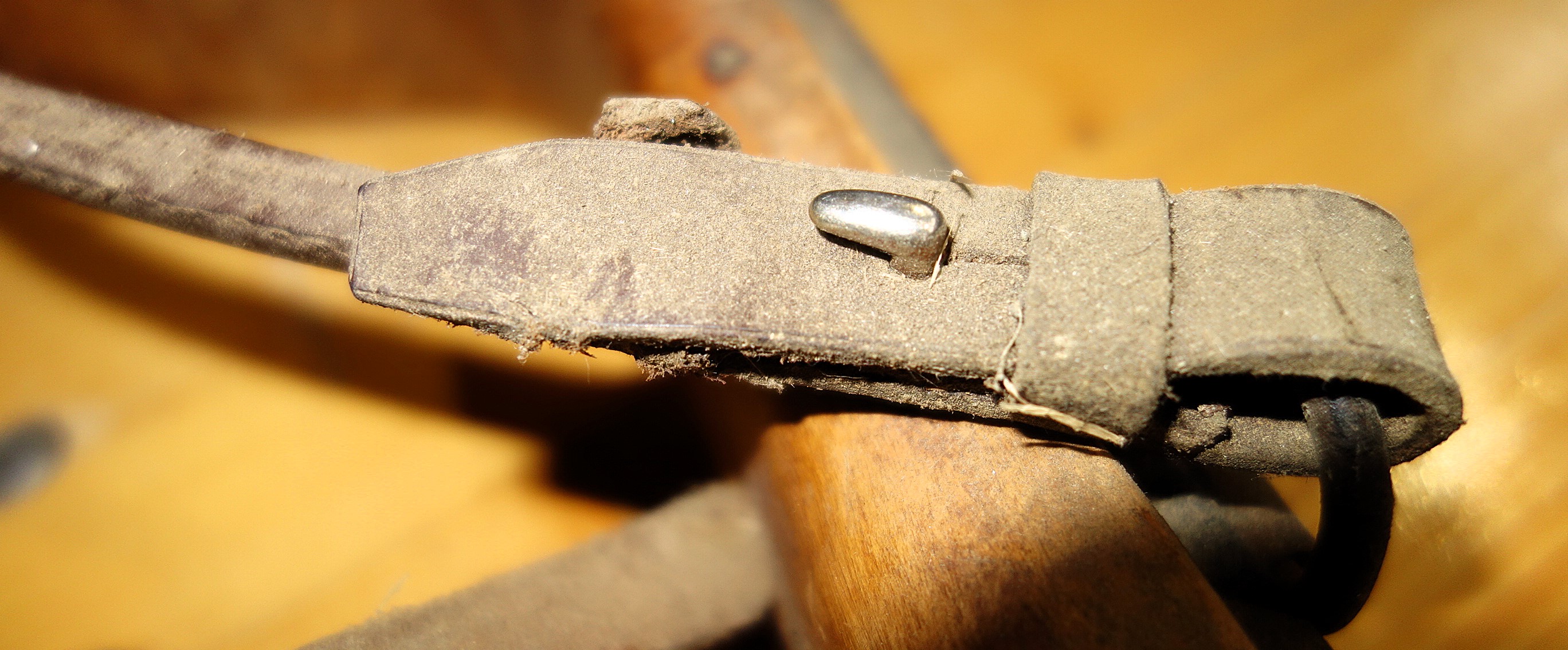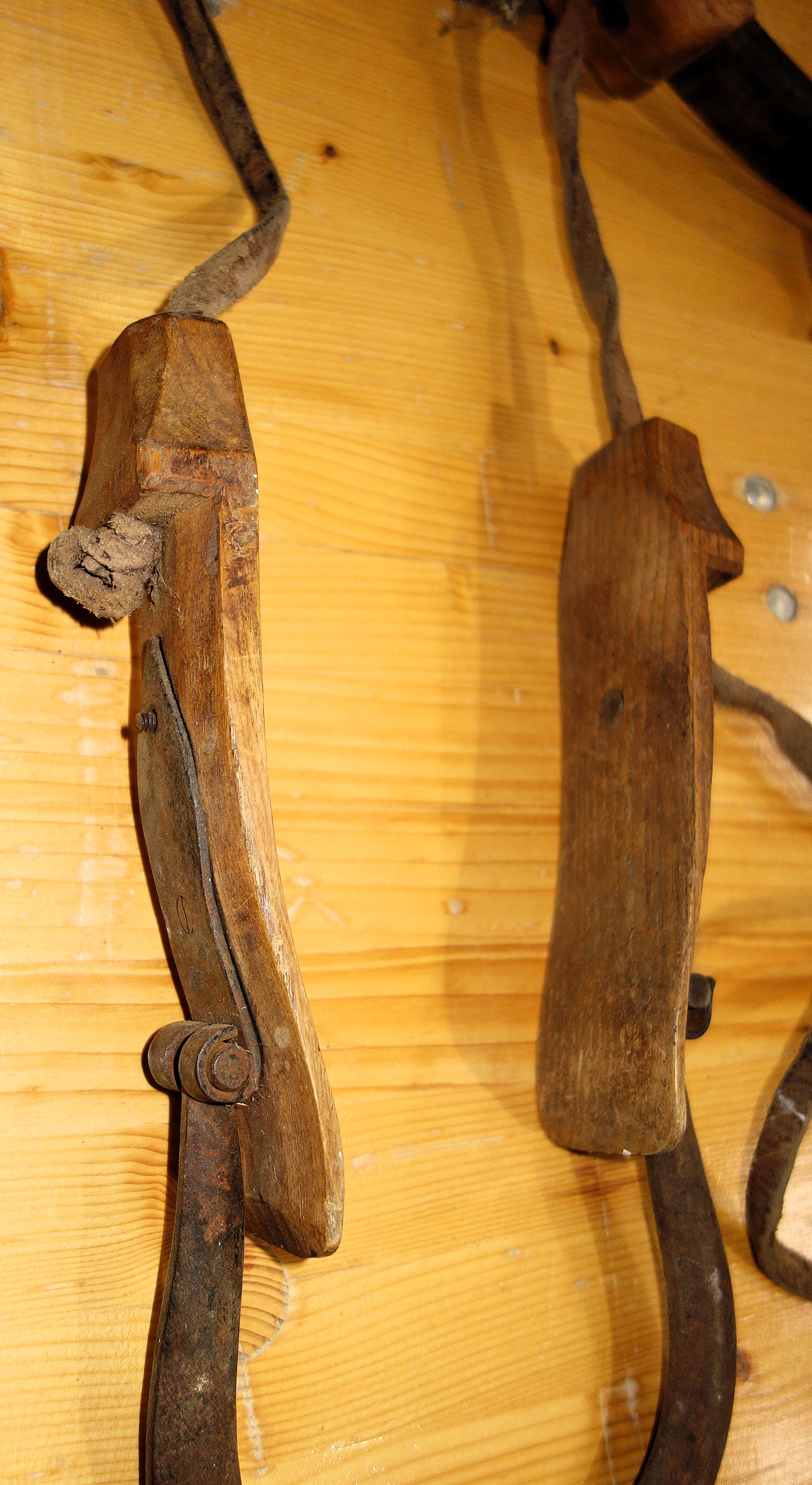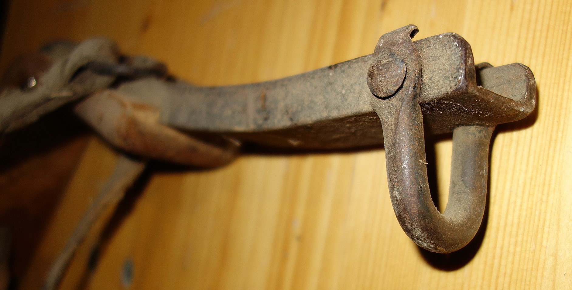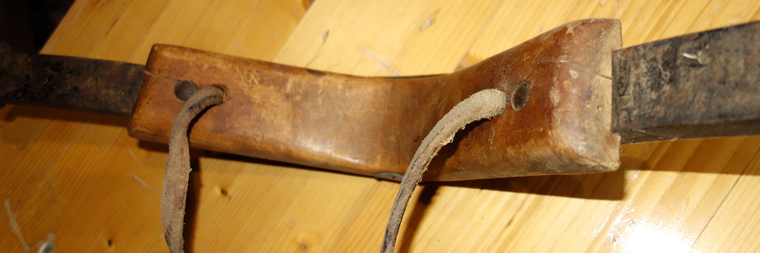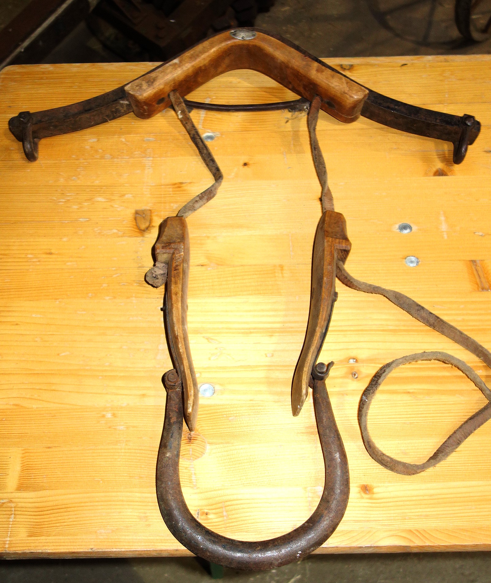 Fangen wir mit dem stabiler gebauten Joch an. Der Zahn der Zeit und fleißige Untermieter haben deutliche Spuren hinterlassen. Trotzdem kann man viele Details erkennen. Der Jochbaum ist aus einem passend gewachsenen Holz geschnitten. Oben befinden sich verstärkend 2 Eisenbänder, zwischen 30 und 36cm lang, 2,5cm breit, mit jeweils 7 Nägeln am Holz befestigt. Sie sind dem Verlauf des Holzes hervorragend angepasst, scheinen aber nicht aufgebrannt worden zu sein. Der Jochbaum ist 68cm breit, ca. 22cm hoch und 7cm bzw. sich an den Seiten verjüngend 6cm dick. Die Auflage für den Widerrist ist 14cm breit und 5cm hoch. Ein repariertes, aus 2 unterschiedlichen Stücken zusammengenähtes Lederband, 60cm lang, 1,3cm bzw. 1,6cm breit und 0,5cm dick verläuft in der Rinne auf der Jochbalken-Mitte und tritt durch das Holz nach unten durch um die Knebel zu halten. Die rechte Seite dieses Bandes endet in einer Strupfe während die linke einen 5cm großen, handgeschmiedeten Ring hält. Rechts kann die Strupfe in einem 8cm kurzen Schnallriemen längen-verstellbar befestigt werden. Dieser wiederum geht von einer eisernen Öse aus, welche mit ihrem Arm 13cm lang und sich verjüngend mittels drei Nägeln am Knebel befestigt ist. Oberflächlich betrachtet erscheinen diese Klöppel verkehrt herum angebracht worden zu sein. Hier ist das dicke Ende unten, statt oben. Genau angeschaut erkennt man wie durchdacht das Holz geschnitzt ist: die eiserne Befestigung oben verlangt nach keiner Verstärkung des Holzes und unten bietet das leicht gebogenen Ende einem durchgezogenen und verknoteten Hanfstrick guten Sitz. Die zum Hals des Tieres weisende Fläche ist gerundet und läuft unten in parallele Enden aus. Ein kleiner Knick nach außen schützt zumindest die Ansätze der Knoten des Hanfstrickes. Auf der linken Seite besteht die Verbindung zwischen Knebel und Lederriemen aus einem eisernen Haken, welcher nach außen zeigt und zum Gebrauch des Jochs einfach in den Ring eingehängt wird. Die Zugaufnahme an den Jochbalken-Enden besteht aus ovalen Durchlässen, 5cm lang und 2 cm breit. Gewicht: 2,5kg