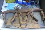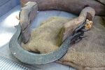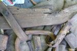 Das andere Joch ist kleiner, schmaler. Der Jochbalken ist 64cm breit, 20cm hoch und 6,5cm in der Mitte bzw. 5,5cm an den Seiten dick. Deutlich abgeschrägte Kanten lassen das Joch elegant und leicht wirken. Auch hier waren Untermieter aktiv und der Bereich der Zugaufnahme zeigt deutliche Abnutzungsspuren durch reibende Seile. Eine 24cm lange, 3cm dicke und 4,5cm breite Eisenplatte verstärkt den Mittelbereich des Jochholzes. Mit zwei vernieteten Nägeln ist sie oben angebracht und 8 parallele, nutzlose Löcher lassen eine anderweitige Vornutzung vermuten. Die Hanfschnur, welche die Knebel hält liegt offen und ungeschützt darauf. Zwei 1cm große Löcher in der Eisenplatte und dem Jochholz ermöglichen den Durchtritt des Seils nach unten an die Knebel. Die Widerristauflage ist extra herausgearbeitet, 11cm weit und 3cm hoch. Neben der Auflage tritt das Seil aus, wobei auf einer Seite das Loch dafür so nah am Nagel, der die Eisenplatte hält, zum Vorschein kommt, daß der Nagelkopf angepasst werden mußte. Das obere, 3cm x 3cm x 3,5cm große Knebelstück hat zentral ein Loch für das Hanfseil, welches im unmittelbaren Anschluß darunter einmal um das Knebelholz gewickelt und mit sich selbst verknotet ist. Der weitere Verlauf des Knebels ist sanft gebogen und abgerundet damit es am Hals nirgends scheuern kann. Den unteren Verschluß bildet ein weiteres Hanfseil indem es durch je ein Loch im Knebel geführt eine Schlinge um das betreffende Holz macht. Die Zugaufnahme an den Seiten des Jochbaumes besteht auch hier aus 5cm x 2 cm großen Löchern. Gewicht: 1,4kg