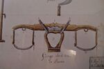 Alter Druck von landwirtschaftlichen Geräten, hier ein Widerristdoppeljoch aus Parma. Interessant die Schiebekonstruktion zum seitlichen Verstellen des Jochrings. Die großen Ringe in der Mitte der Widerristauflage dienen als Leinenringe, hier verlaufen die beiden Leinen, die von den Nasenbremsen der Zugrinder mittig über den Kopf hochkommen. Außerdem vermute ich, daß der Zeichner sich in der Materie nicht wirklich ausgekannt hat: die Verknotung der Halsbefestigung links (die des Hand-Ochsen) gehört nach außen.
