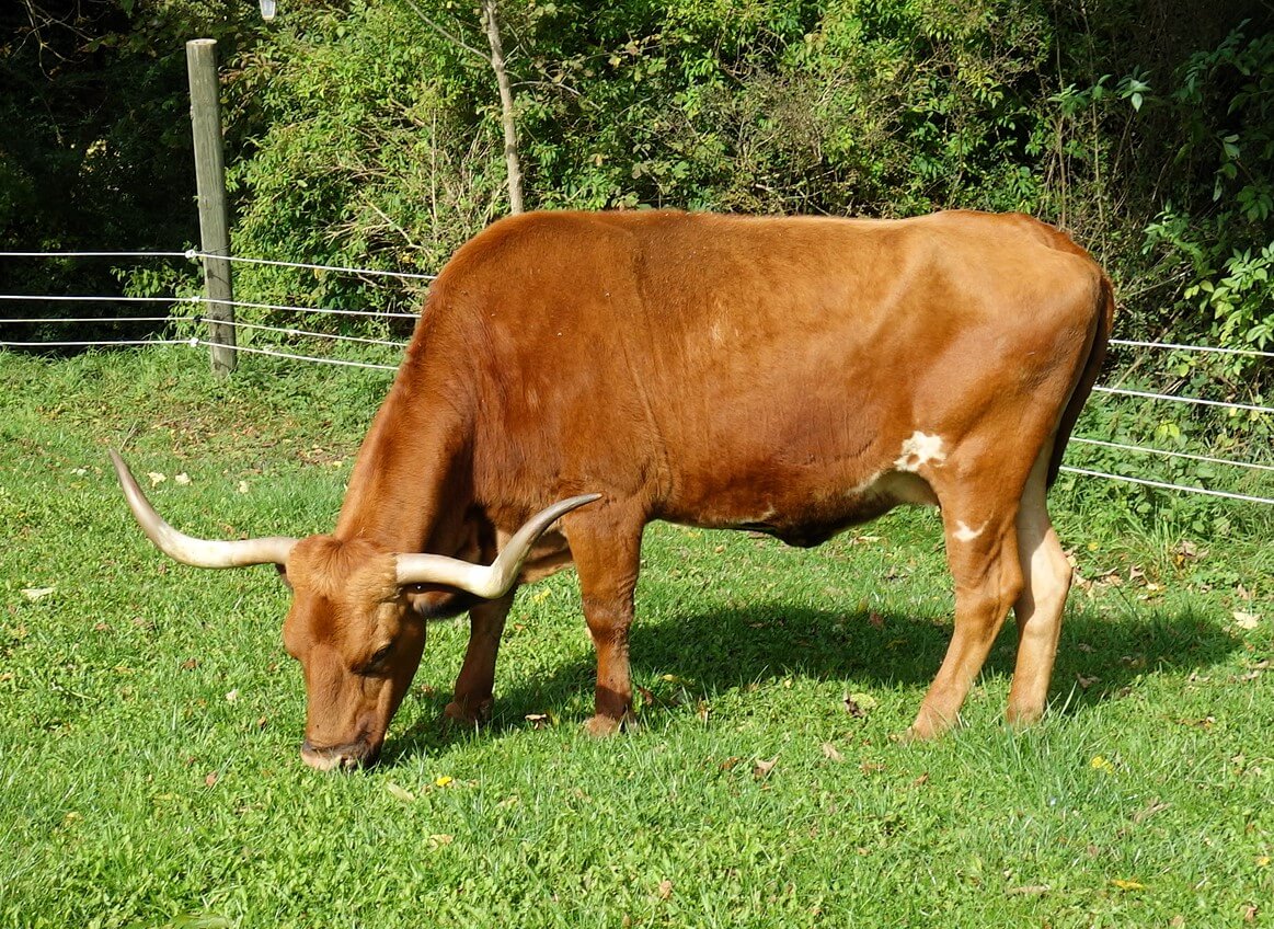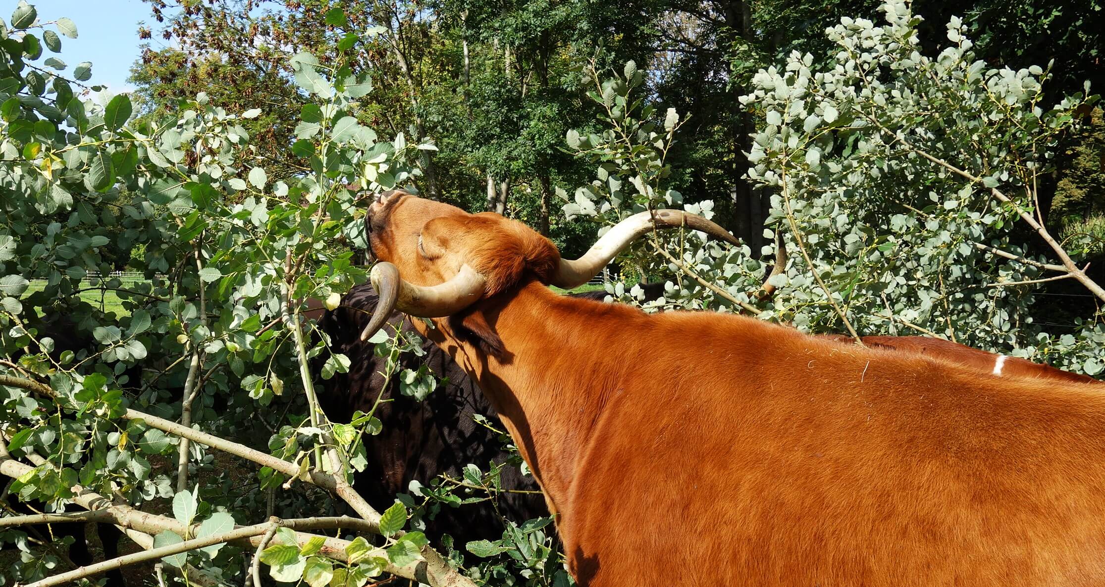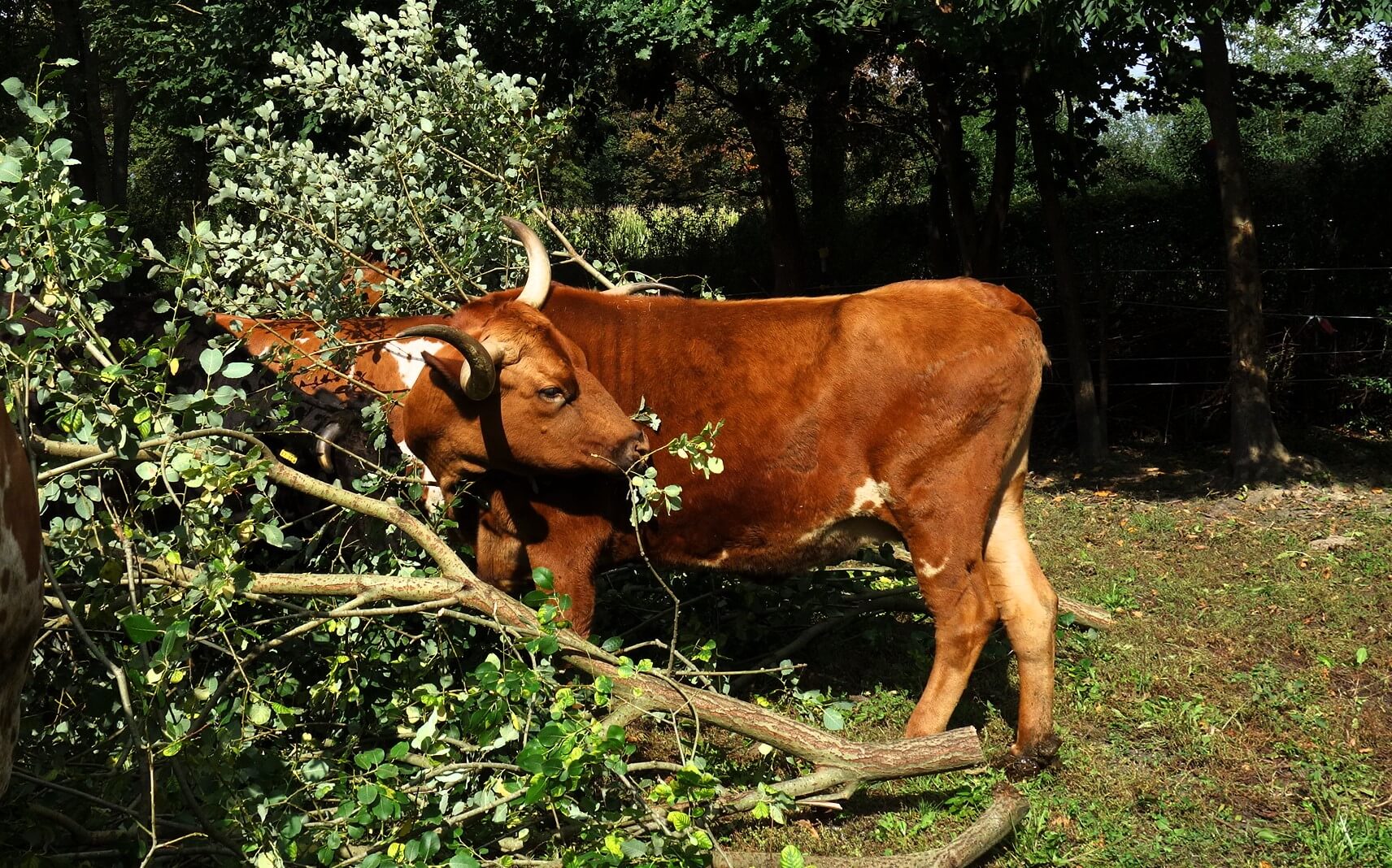 Texas Longhorn Rinder, wie wir, haben einen anderen Stoffwechsel wie Hochleistungskühe, wir sind quasi die Ponies unter den Rindern. Die Amerikaner unterscheiden Browser und Grazer, da gibt's im Deutschen keinen passenden Wortschatz. Wir fressen bevorzugt Laub neben Gras und die Weiden hier im Erdinger Moos sind für uns fast zu fett. Unsere Vorfahren sind meilenweit gegangen um den nächsten dürren Halm zu finden.