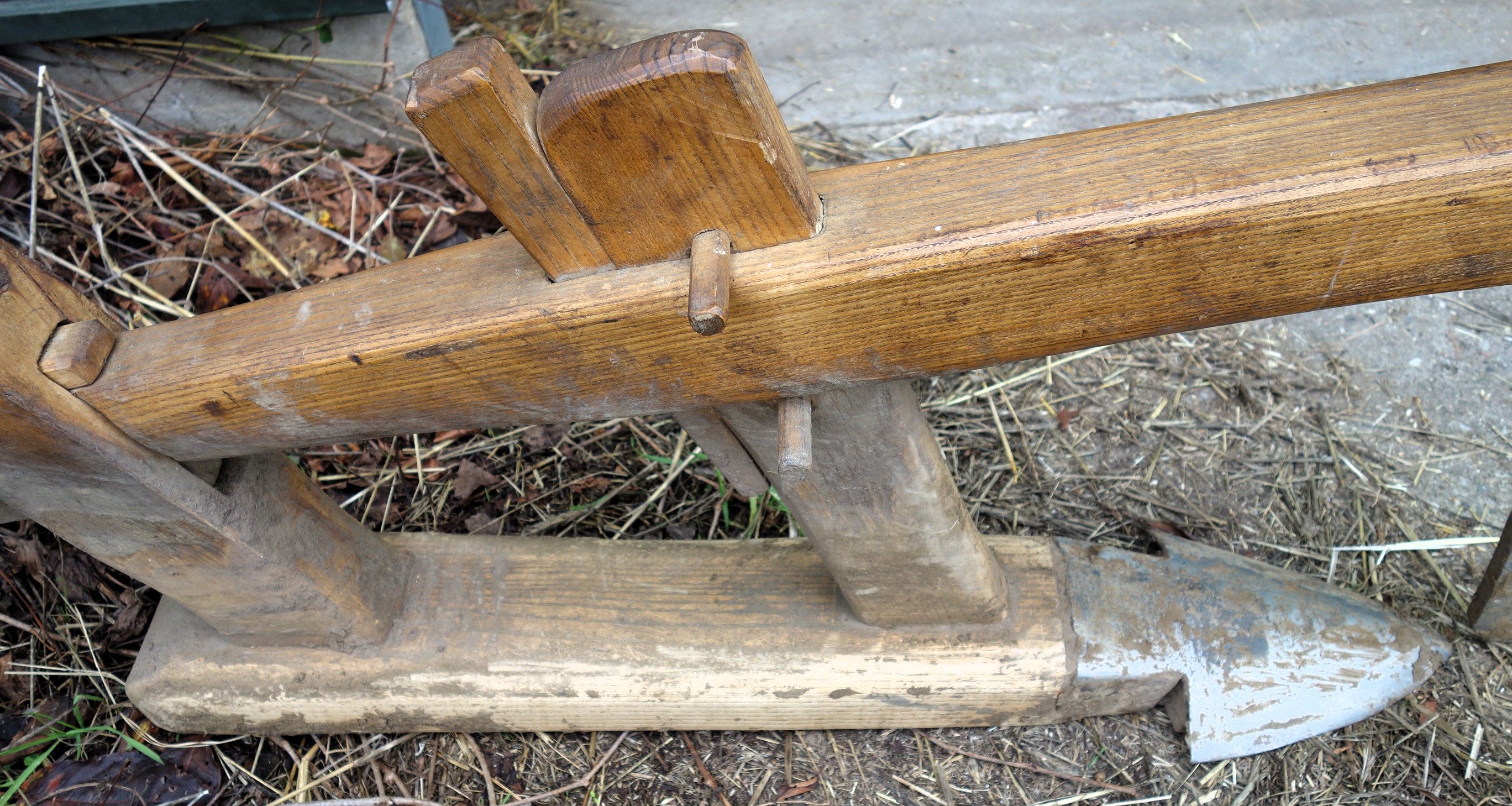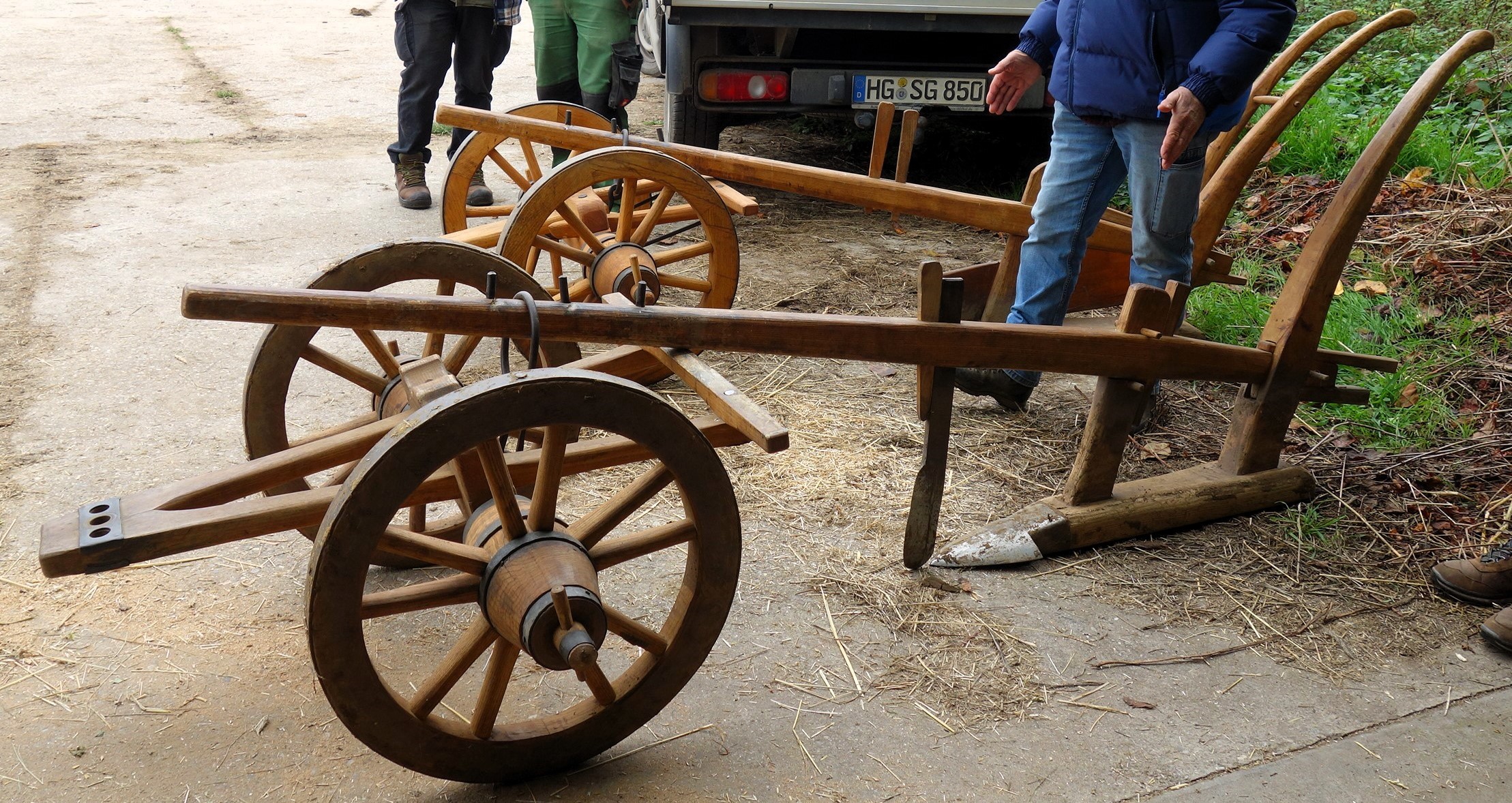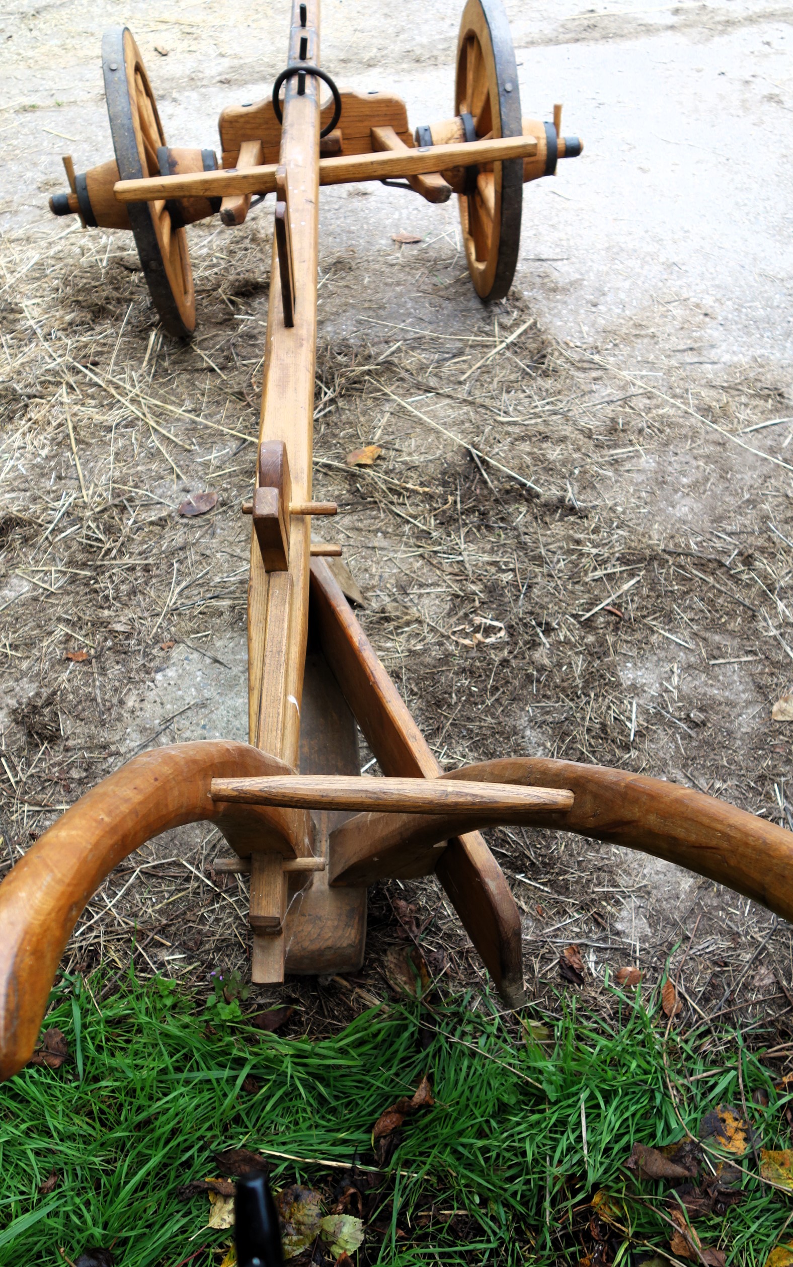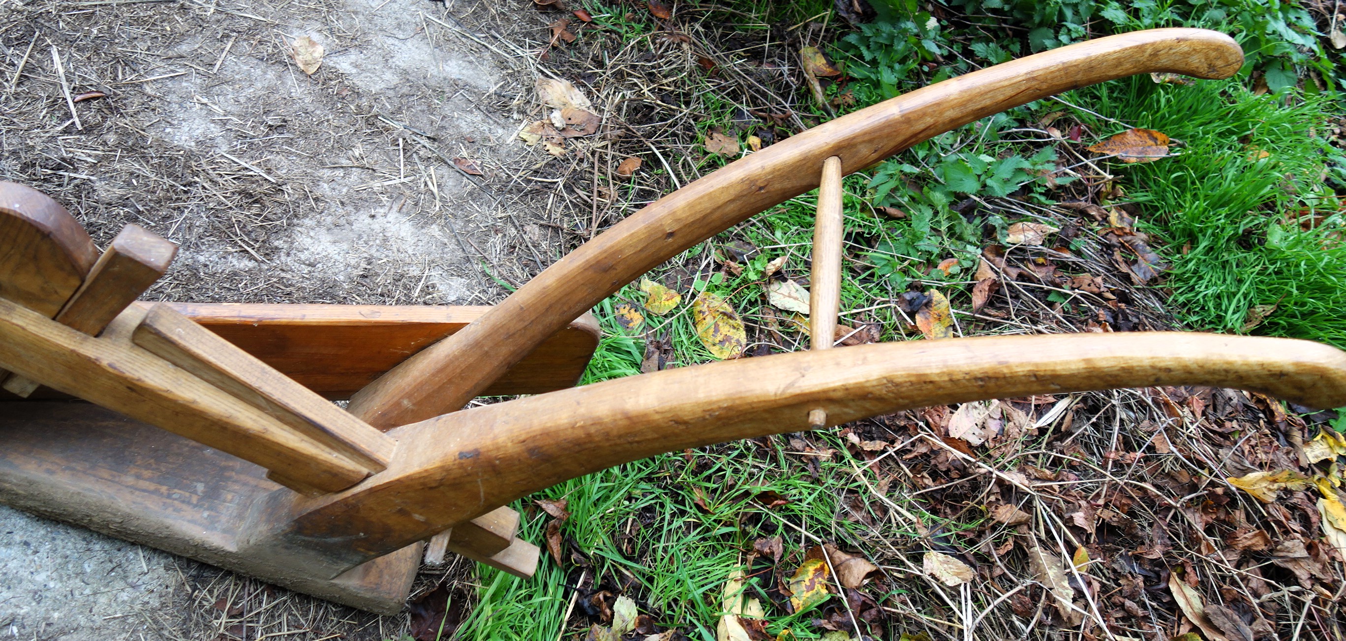 Dieser hier vorgestellte Krümelpflug wurde vom Freilichtlabor Lauresham nach alten Vorlagen rekonstruiert. Aus einem simplen Hakenpflug weiterentwickelt wurde hier die hölzerne, symmetrische Pflugspitze, die den Boden nur anhebt, krümelt und nicht wendet, schon mit einer Eisenplatte verstärkt. Ferner wurde ein Messersech eingebaut und ein Pflugkarren dazu genommen, letzteres um die Händelbarkeit des Gerätes deutlich zu erleichtern. Fast modern das Teil...