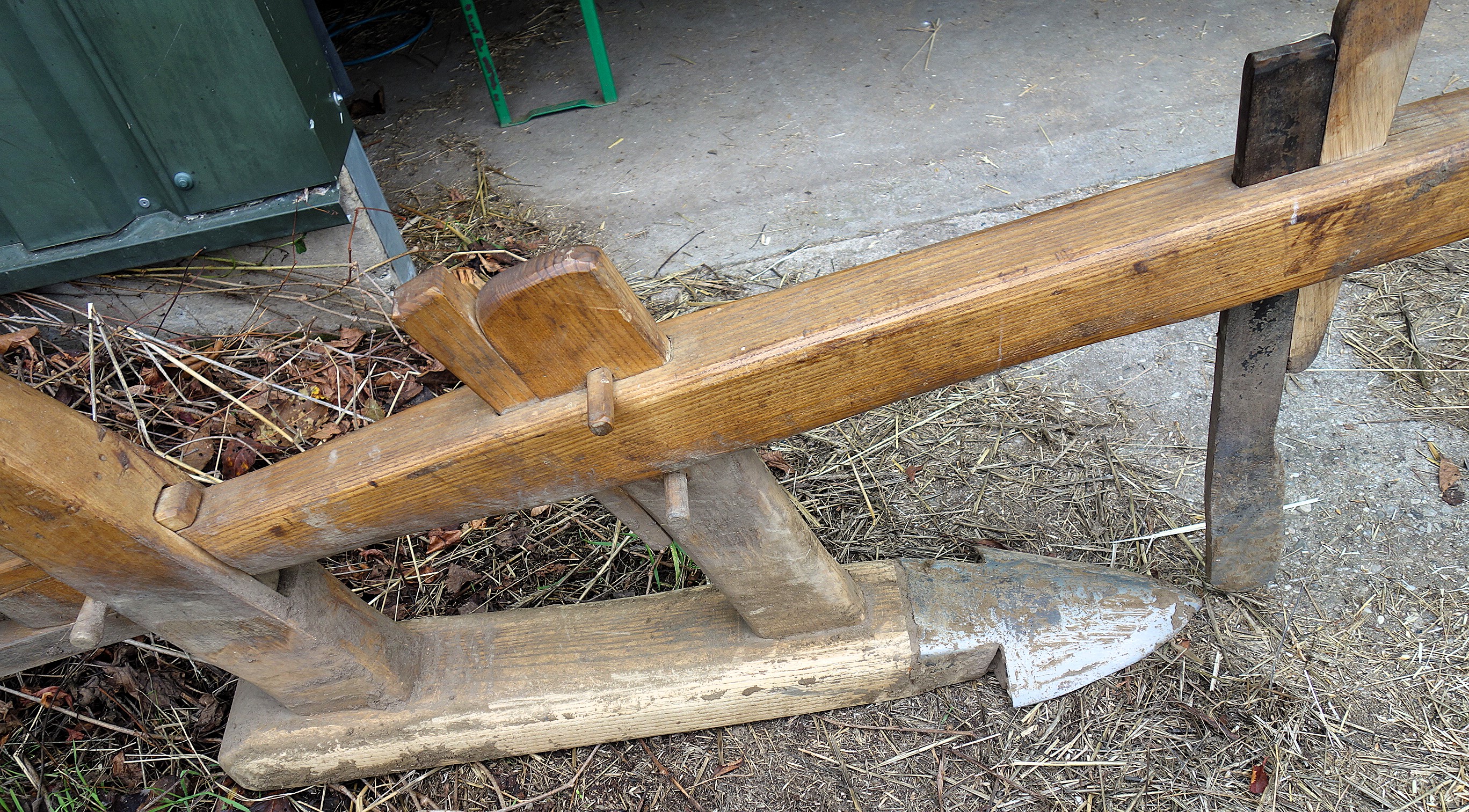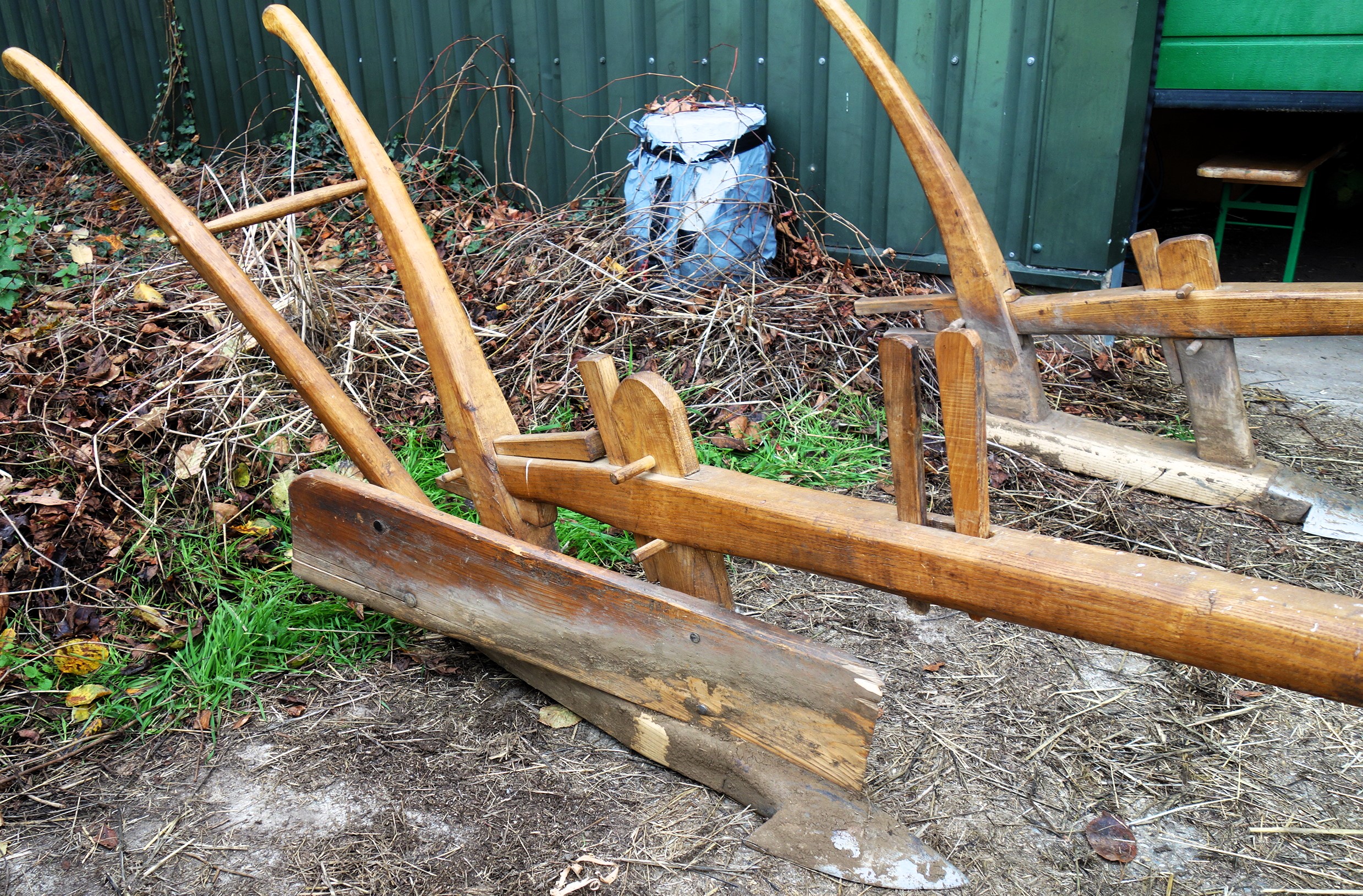 Hier sehen wir einen weiteren Krümelpflug vom Freilichtlabor Lauresham, Lorsch, auch nach alten Vorlagen rekonstruiert. Hier gibt es die Möglichkeit ein Messersech anzubringen und der Pflug hat ein hölzernes Streichbrett, das die Erde aber nicht wenden kann.