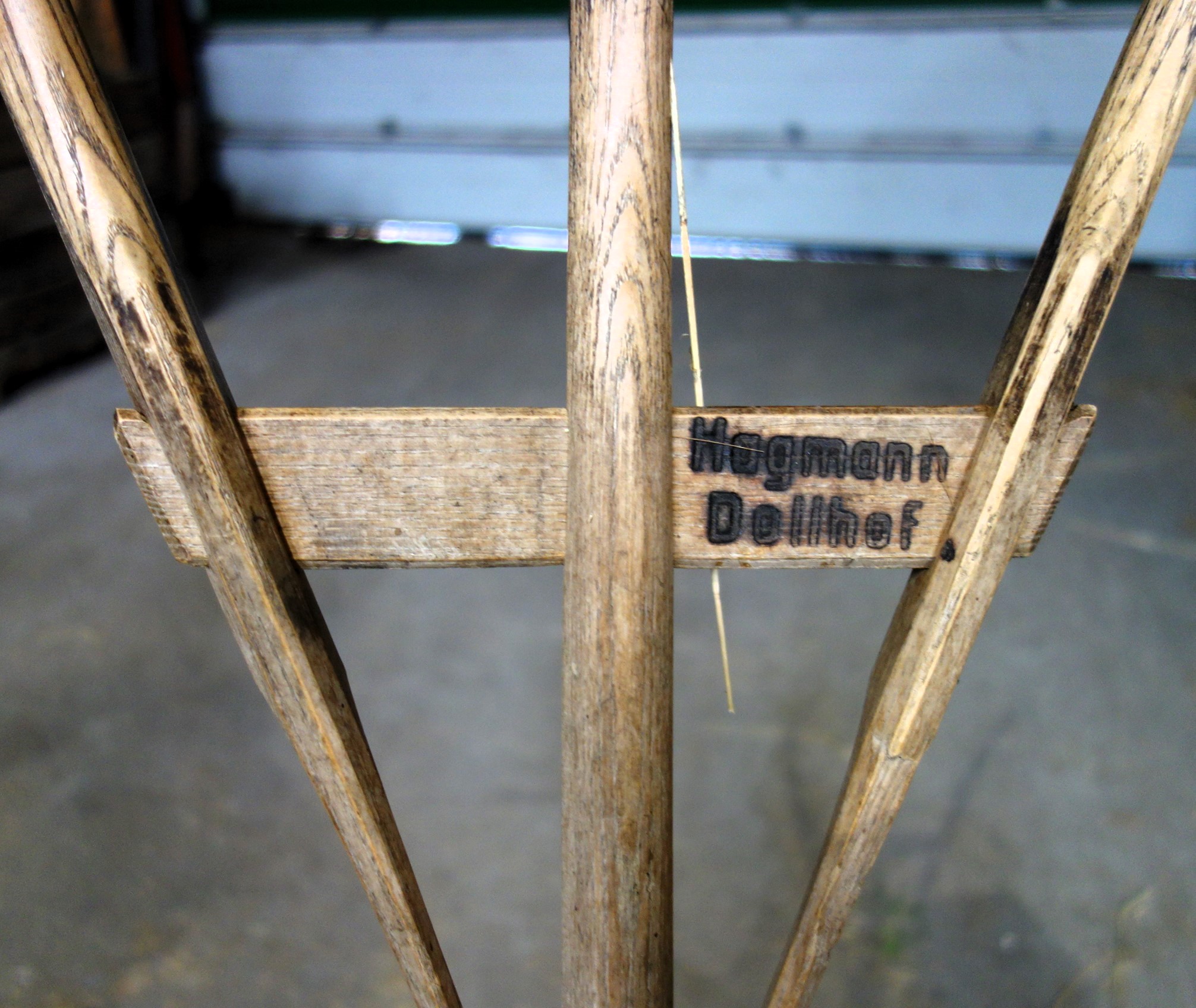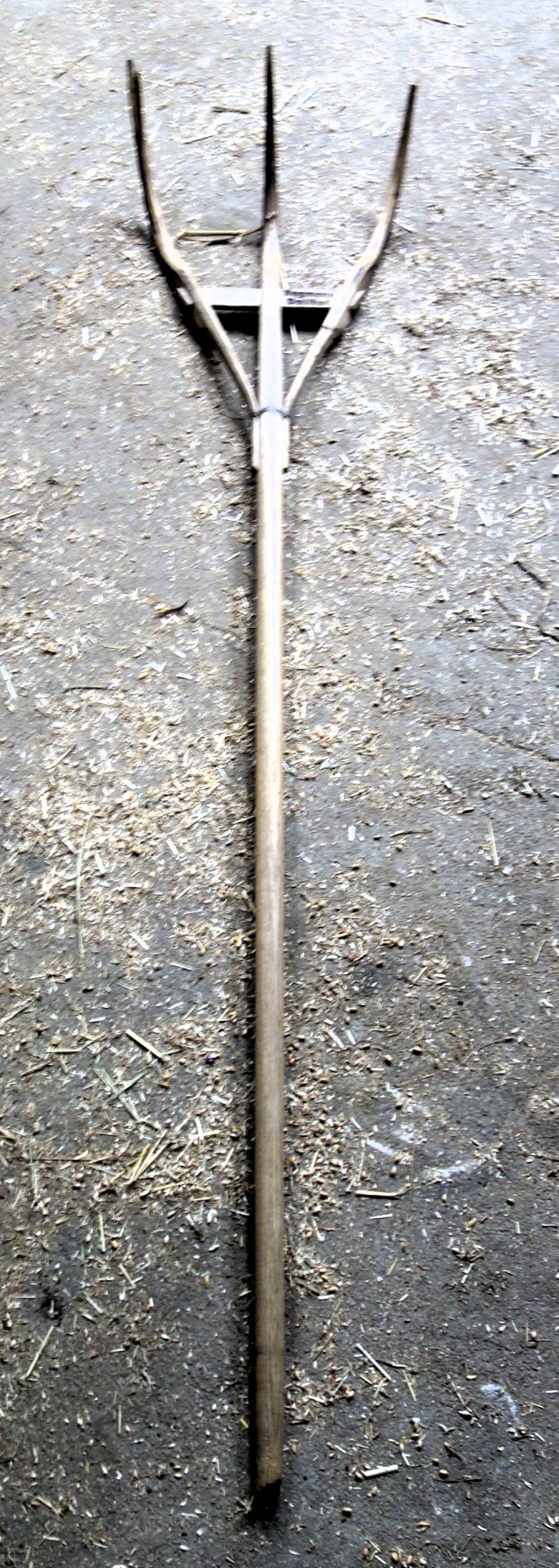 Diese Stallwerkzeuge werden nur zum Einbringen, Lagern und Verteilen von Futter benutzt, nie zu etwas anderem. Heugabeln haben nur 3-4 (seltener 2) lange, schmale, gebogene Zinken, meist messerscharf an den Spitzen. Diese alten, hölzernen Heuforken waren naturgemäß nicht alle mit geradem Stiel. Noch wichtiger war, daß dieser lang und elastisch (gern aus Eschenholz) war und die Gabel selbst leicht, damit das lose Heu oder auch langhalmiges Stroh bzw. Garben auf den Wagen und später in die Scheune hoch gegabelt werden konnte. Wie wichtig diese Gabeln früher waren kann man an der namentlichen Zuordnung dieses handwerklichen Geräts erkennen. Voraussetzung für eine Energie sparende Arbeit ist eine für die jeweilige Person passende Ergonomie, besonders wenn die Gabel viel benutzt werden sollte. Wie immer spielt auch die Technik eine Rolle, die kleinen Tricks mit denen die Arbeit leichter wird. Man muß die gesammelten Halme möglichst in Längsrichtung anstechen, das spart die meiste Energie.