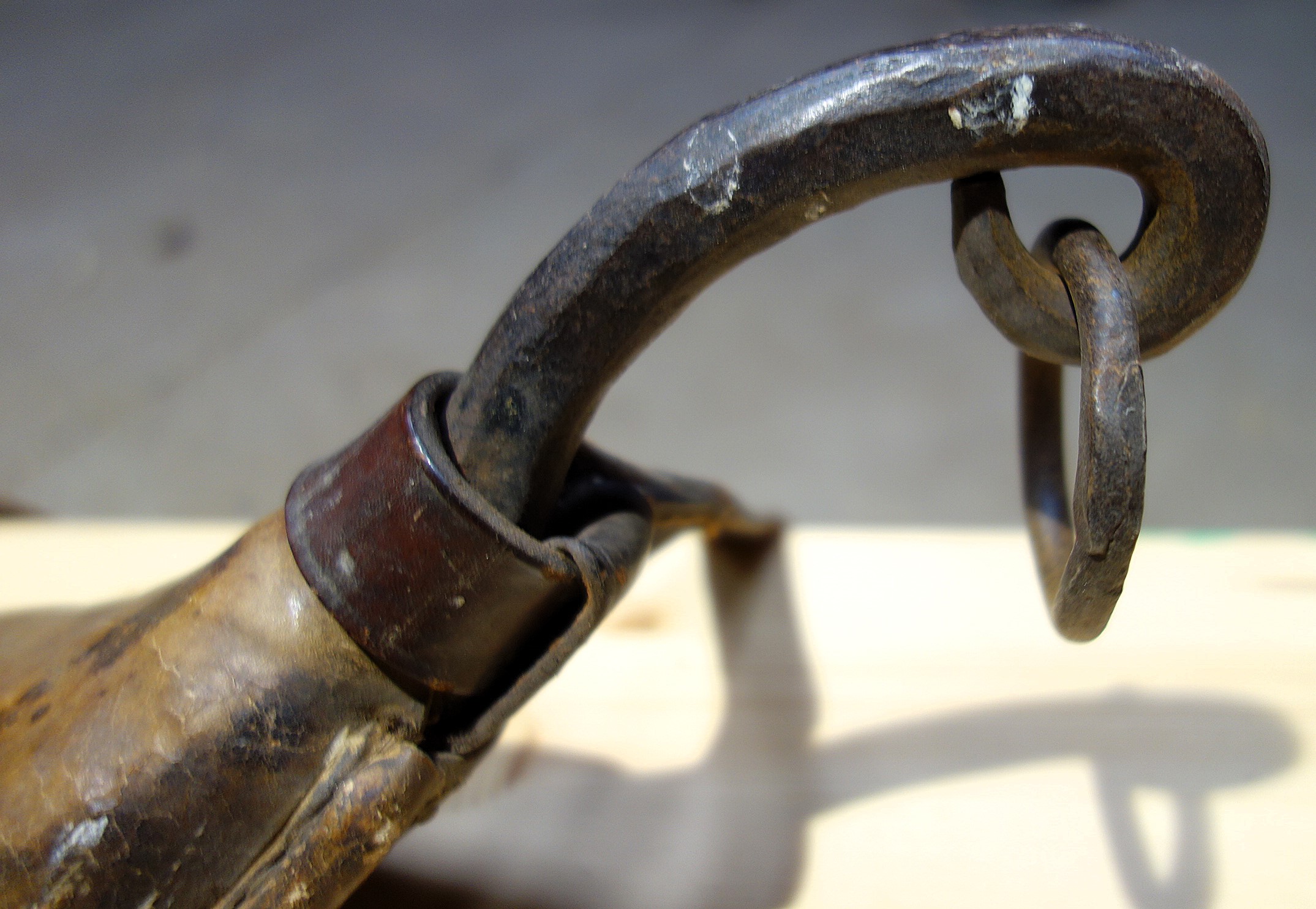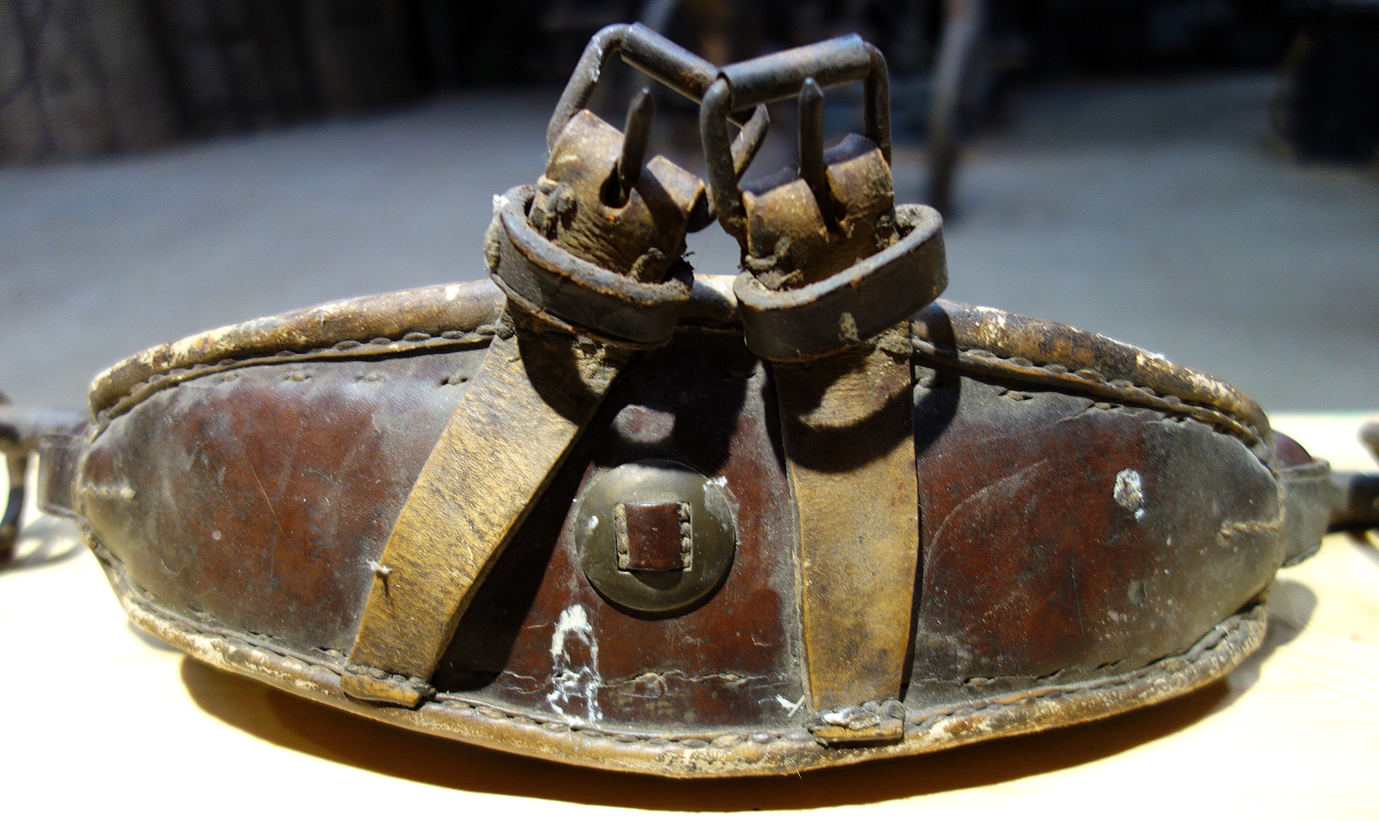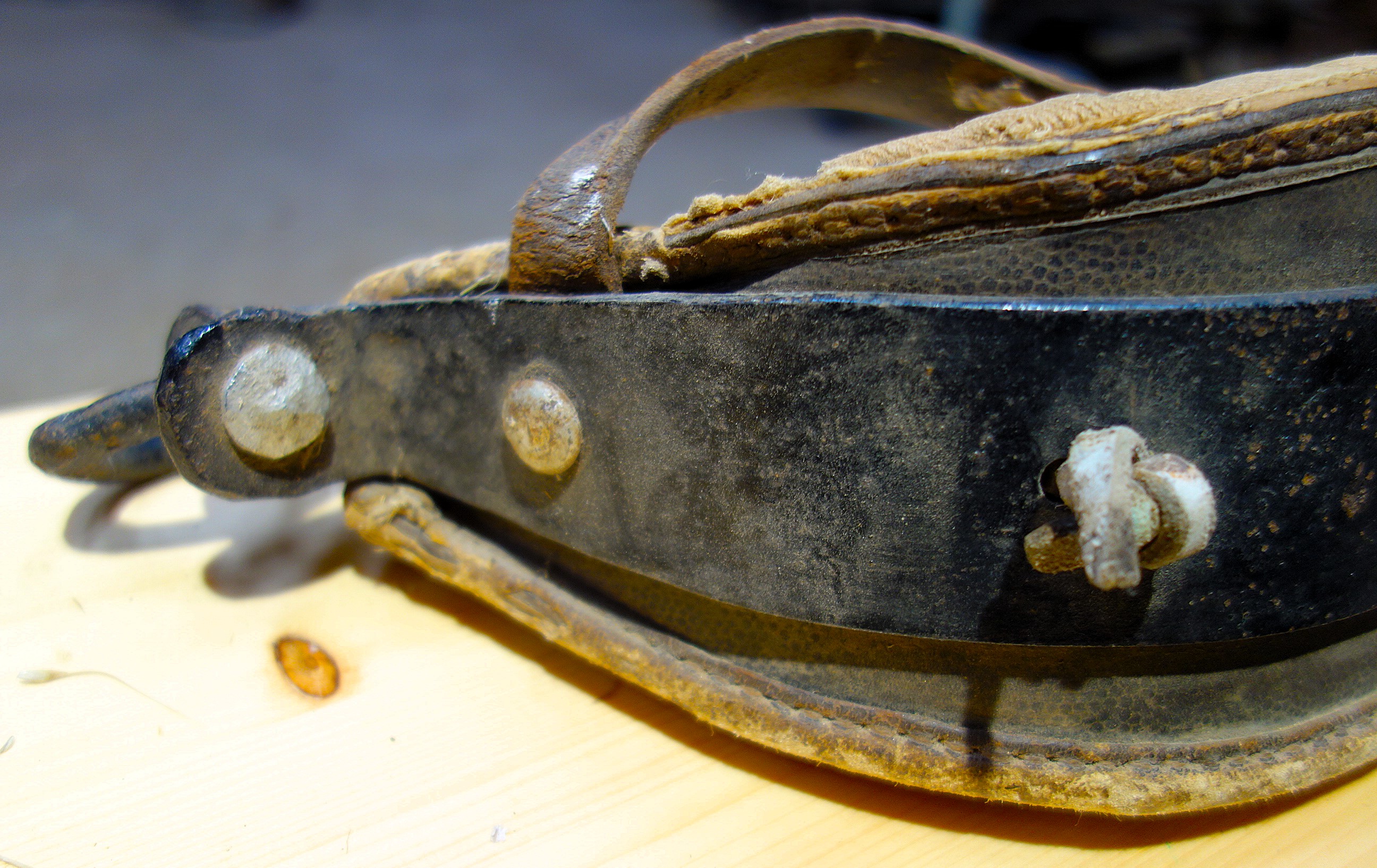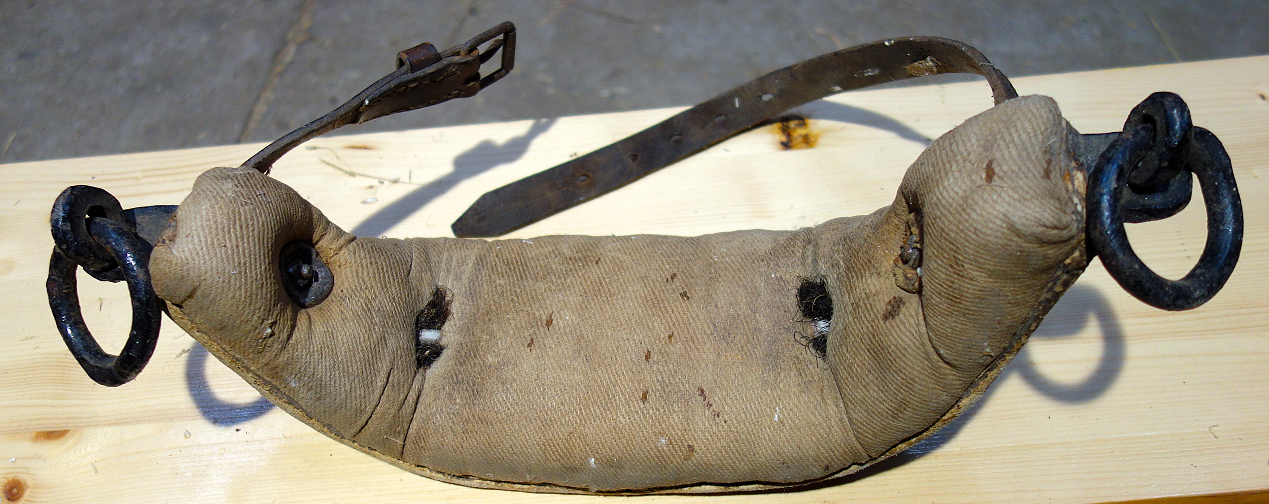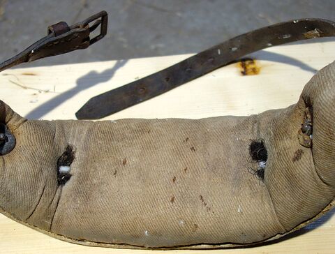 Hier ein Stirnjoch aus dem Freilichtlabor Lauresham, Lorsch, mit getrenntem Eisenbogen und Stirnpolster. Einfach zu reparieren wenn es kaputt geht oder das Polster nachstopfen braucht. Mittig befindet sich der Rest eines am Polster angenähten, abgerissenen Riemens, original würde er weiter oben eine Schlinge bilden durch die der Hornriemen verläuft. An dieser Stelle sitzt im eisernen Jochbogen eine Zierniete. Rechts und links davon sind Knoten aus Lederschnüren sichtbar, die das Stirnpolster am Metall halten. Seitlich sind die beiden ledernen Hornriemen (links als Schnalle und rechts als Strupfe nach oben austretend) mit durchgehenden Schloßschrauben zwischen Eisenbogen und Polster fixiert. Hier haben die Hörner deutliche Abdrücke am Polster hinterlassen. Vermutlich sind das nicht die Originalschrauben, denn sie stehen auf der Innenseite zu weit vor als daß sie nicht das Tier verletzen würden. Einfacher zum Verschnallen wäre es, wenn die Strupfe links wäre, der Seite von der geführt wird. Das Polster ist vorn aus Leder, auf der Hinterseite aus Drell. An den gekröpften Enden des Jochbogens befinden sich Ösen, die die handgeschmiedeten Ringe für die Zugaufnahme halten.