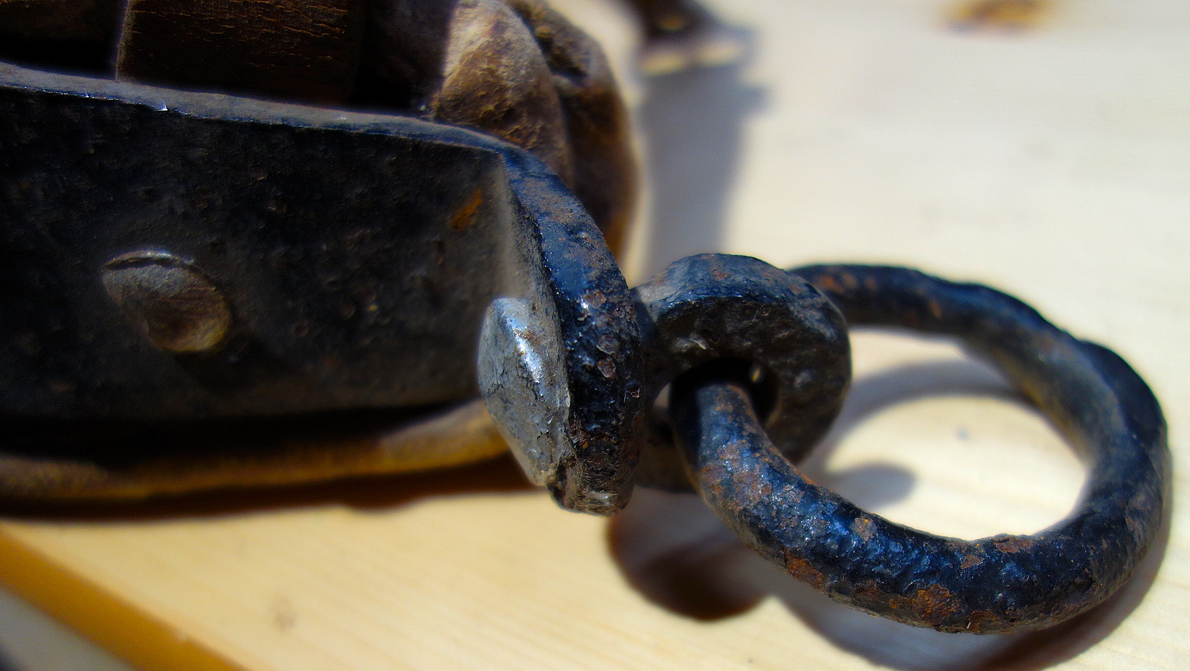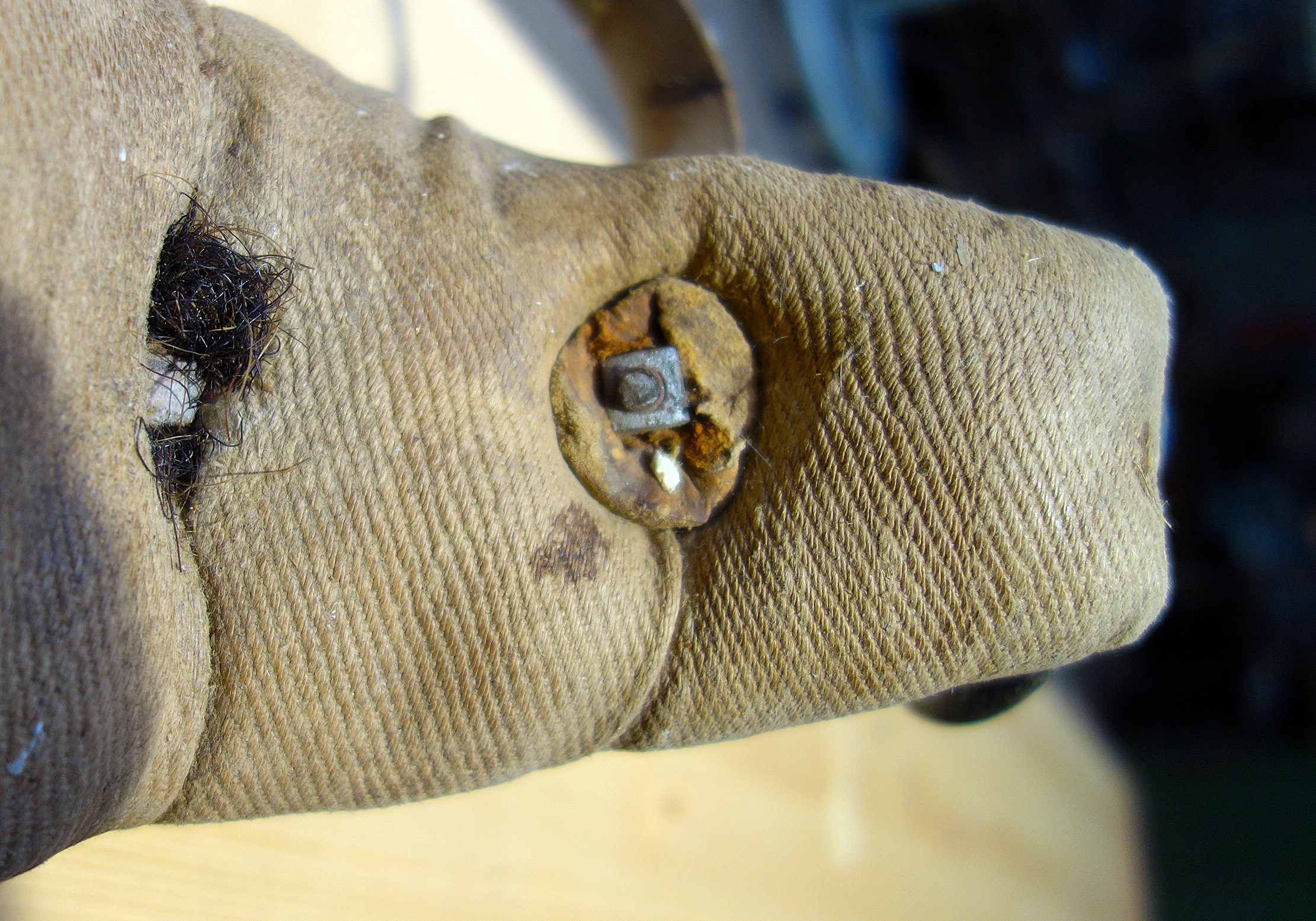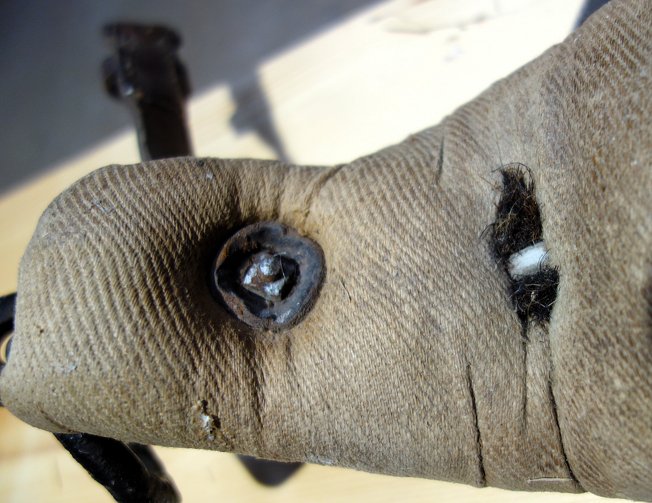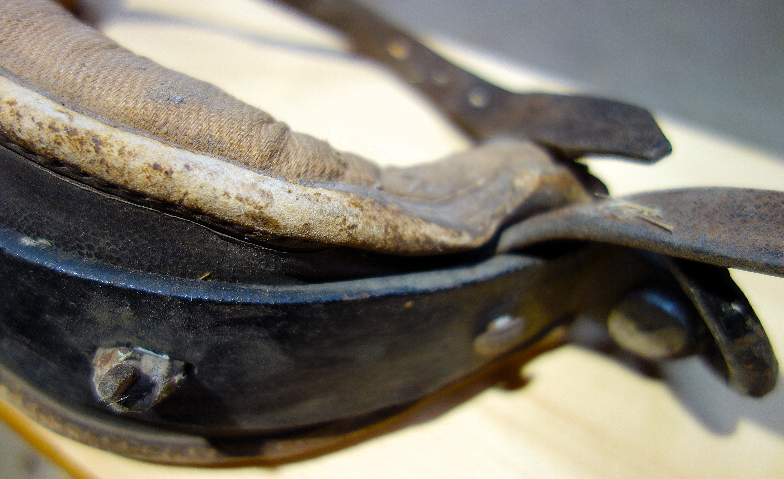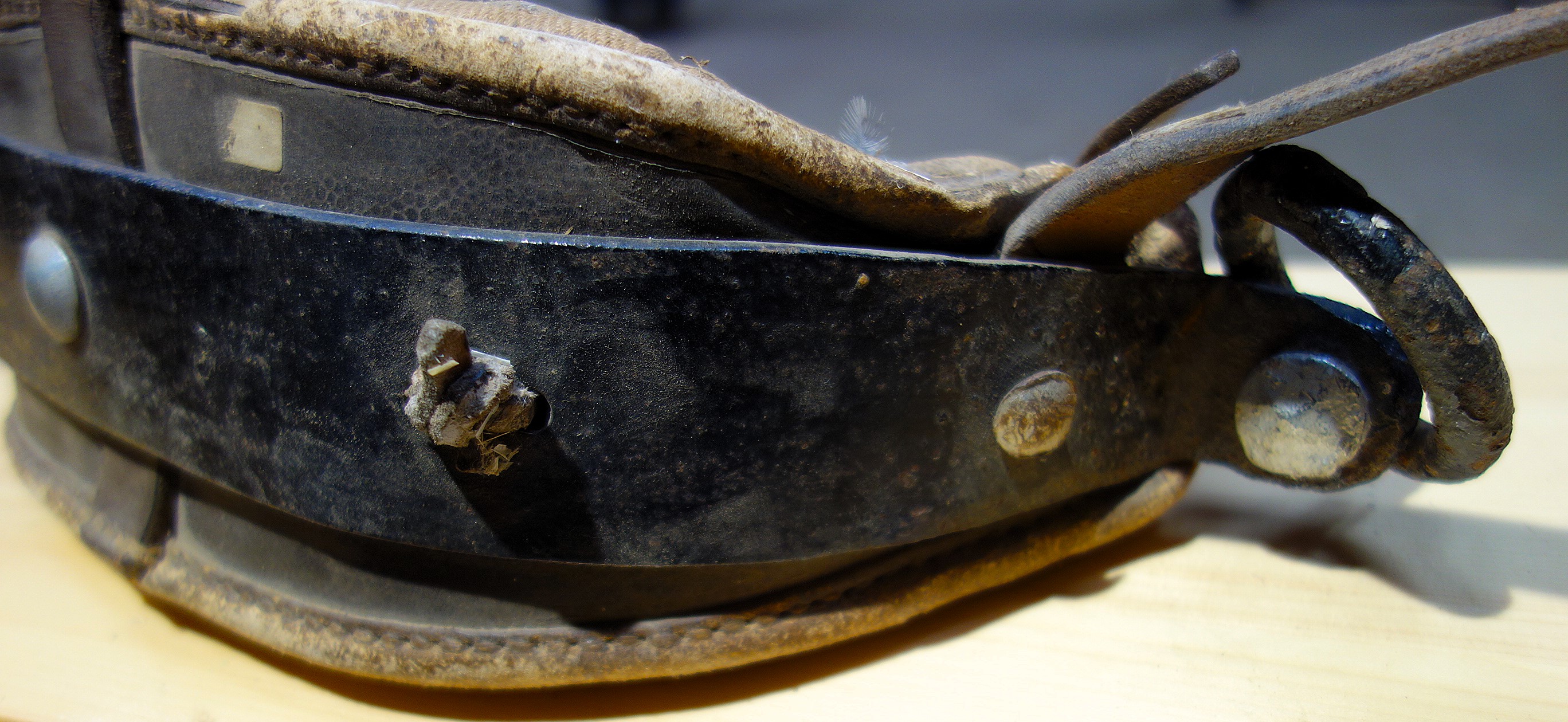 Hier ein Stirnjoch aus dem Freilichtlabor Lauresham, Lorsch, mit getrenntem Eisenbogen und Stirnpolster. Einfach zu reparieren wenn es kaputt geht oder das Polster nachstopfen braucht. Mittig befindet sich der Rest eines am Polster angenähten, abgerissenen Riemens, original würde er weiter oben eine Schlinge bilden durch die der Hornriemen verläuft. An dieser Stelle sitzt im eisernen Jochbogen eine Zierniete. Rechts und links davon sind Knoten aus Lederschnüren sichtbar, die das Stirnpolster am Metall halten. Seitlich sind die beiden ledernen Hornriemen (links als Schnalle und rechts als Strupfe nach oben austretend) mit durchgehenden Schloßschrauben zwischen Eisenbogen und Polster fixiert. Hier haben die Hörner deutliche Abdrücke am Polster hinterlassen. Vermutlich sind das nicht die Originalschrauben, denn sie stehen auf der Innenseite zu weit vor als daß sie nicht das Tier verletzen würden. Einfacher zum Verschnallen wäre es, wenn die Strupfe links wäre, der Seite von der geführt wird. Das Polster ist vorn aus Leder, auf der Hinterseite aus Drell. An den gekröpften Enden des Jochbogens befinden sich Ösen, die die handgeschmiedeten Ringe für die Zugaufnahme halten.