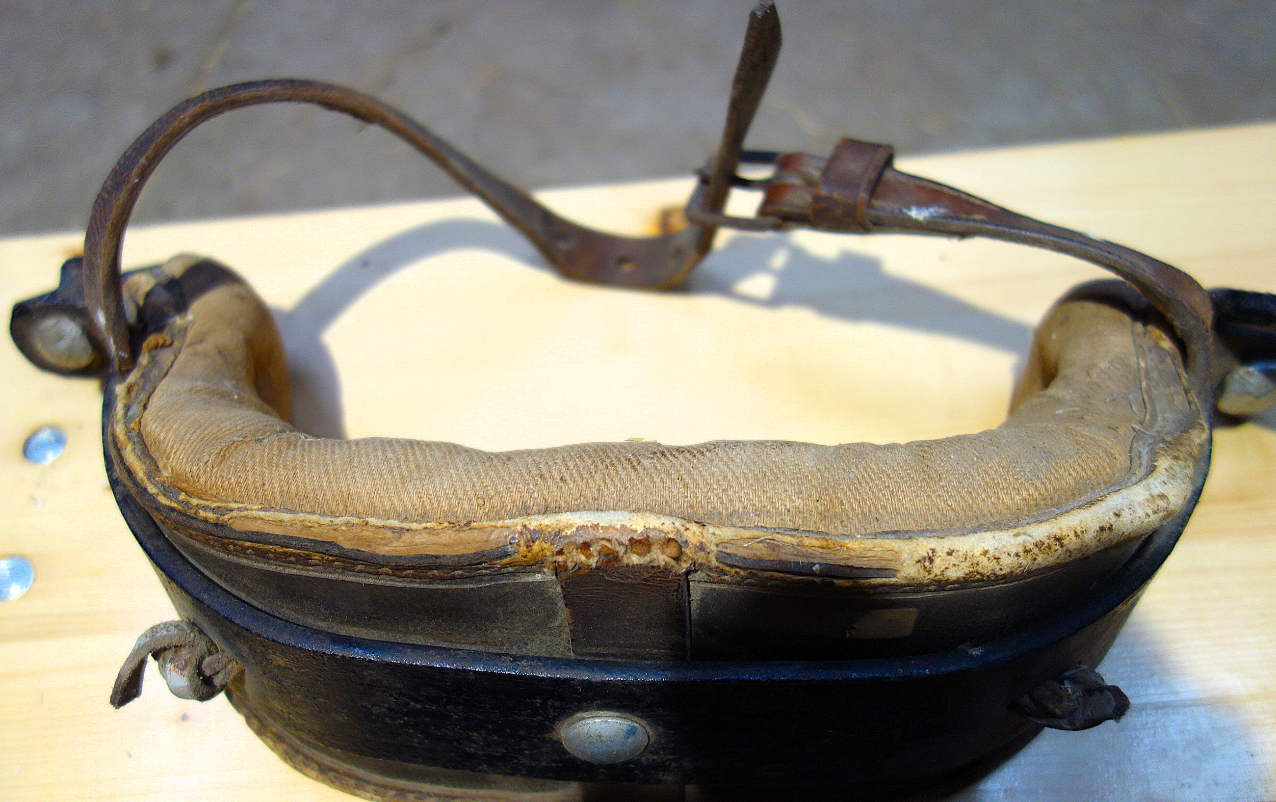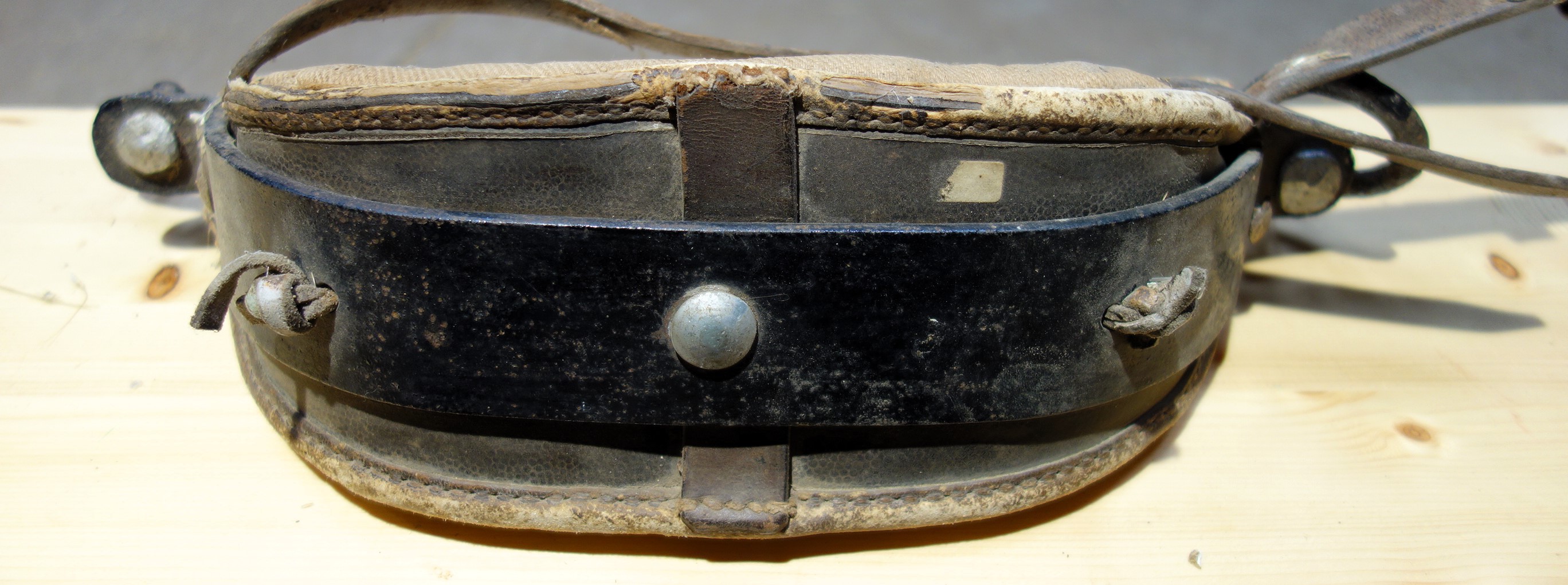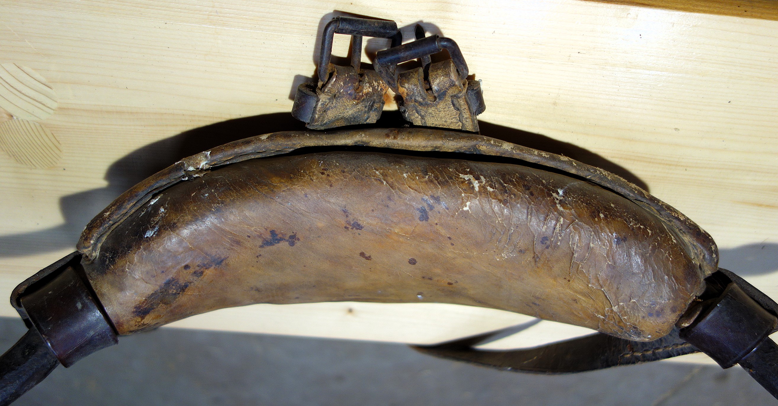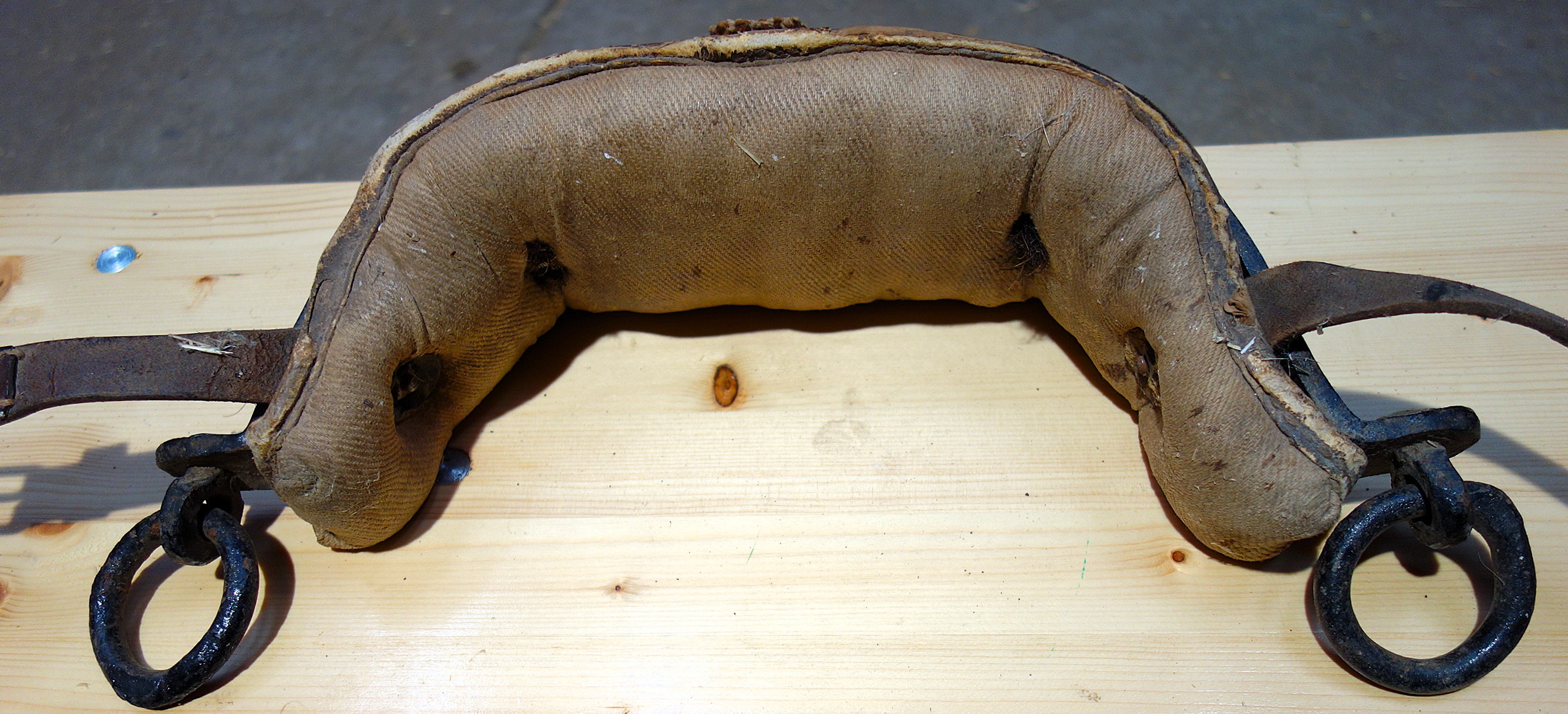 Die beiden Stirnjoche aus Braunfels, Hessen kamen zusammen mit einem 3PolsterKumt. Der 62cm breite Eisenbogen dieses Stirnjochs (Nr.1) ist beidseits gekröpft und zwischen 5cm (Mitte) und 3cm (Seiten) hoch und 0,8cm dick. Die beiden im Kröpfbereich liegenden Schlitze (2,5cm x 0,7cm) die ursprünglich wohl die Hornriemen aufnehmen sollten lassen vermuten, daß die Eisen vorgefertigt und bei Bedarf passend gemacht wurden. Der Bogen wölbt sich 16cm nach hinten; das Stirnjoch hat eine Gesamtbreite von 42cm, wobei die Flügel etwa je 10cm ausmachen und zweimal im rechten Winkel gebrochen sind. An den jeweiligen Enden hängen etwa 10cm große, 3-dimensional gebogene Haken zur Zugabnahme in einem Loch. Sie sind nach oben/hinten offen. Das 4cm dicke Stirnpolster begleitet den gesamten Eisenbogen bis über die 90° Ecken hinaus. Es ist rechteckig geschnitten, zwischen 7cm und 9cm hoch und mittels 4 durchgehender Lederriemen vorn am Eisen fixiert. Diese Lederrriemen sind über runde Zierbleche zum Knoten geknüpft. Zwei weitere Lederriemen an den äußersten Enden des Polsters dienen sowohl der Jochpolster- als auch der Hornriemenbefestigung. Rechts ist der Riemen zwischen Polster und Eisen, links außen auf dem Eisen angebracht. Es handelt sich um den Querriemen der als einfacher Schnallriemen 2cm breit und 20cm (Schnallende) plus 50cm (Strupfe) lang ist. Der zweite Hornriemen geht mittig vom Eisenbogen aus - über den Stirnwulst - nach hinten, wo er eine Schlaufe bildet durch die der erste Hornriemen verläuft. Dieser zweite Hornriemen läuft frei zwischen Eisen und Polster und ist 2,3cm x 60cm. Gewicht: 2,3kg
