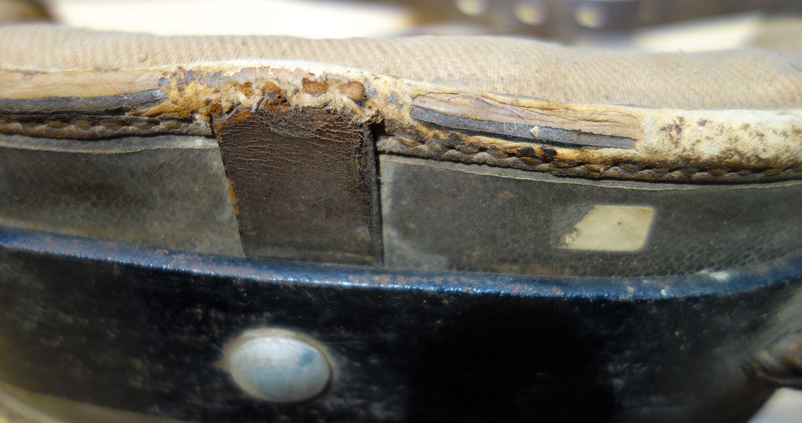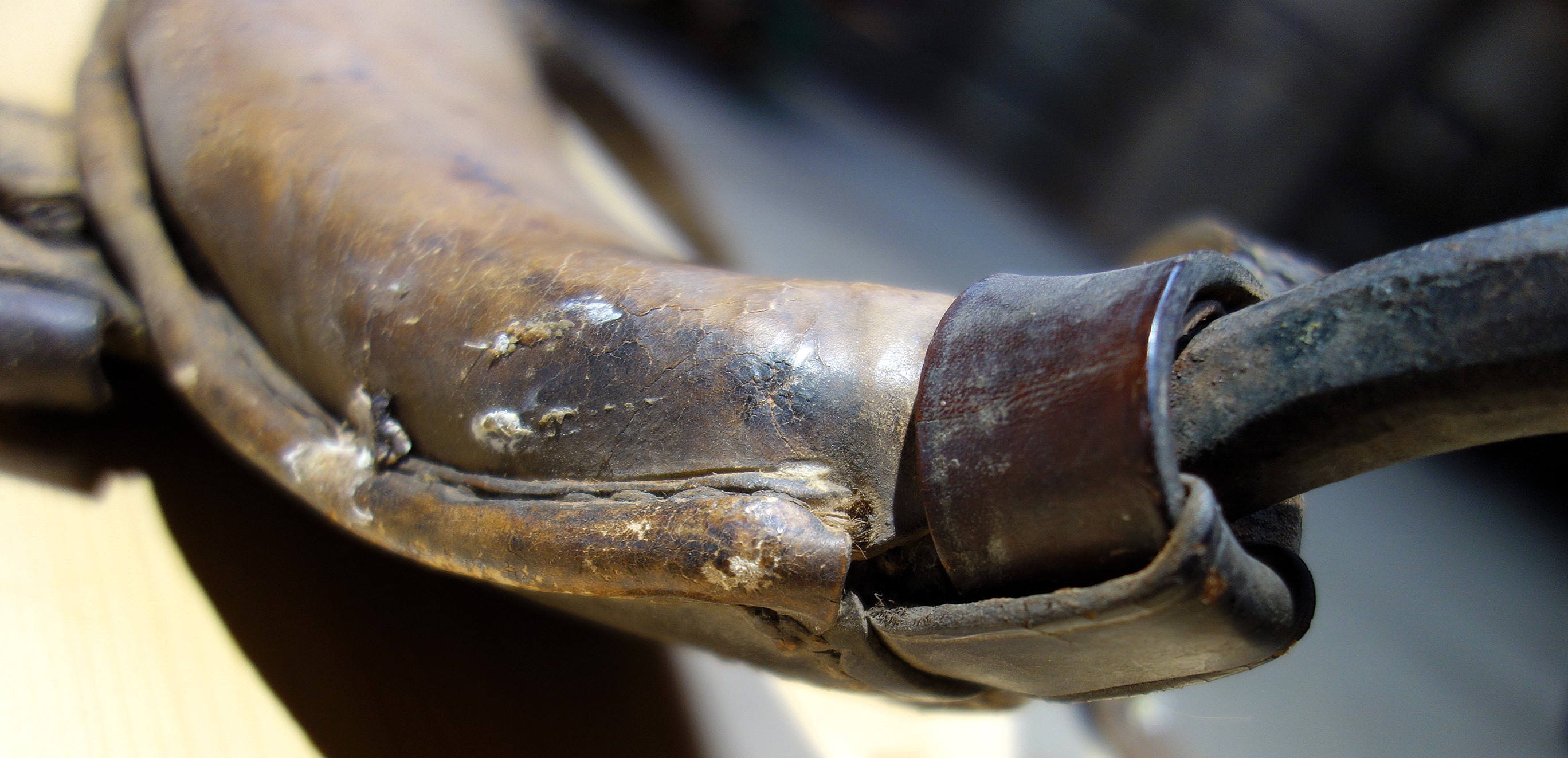 Das folgende Stirnjoch aus Eschenburg, Hessen weist sowohl Merkmale eines rheinisch-pfälzischen als auch eines mittelfränkischen Stirnjochs auf: die Lederverkleidung, das breite Stirnpolster, den ungekröpften Eisenbogen. Letzterer ist insgesamt 45cm breit, 4,5cm (Mitte) bzw. 1cm (Seite) hoch, 1cm dick. Die beiden handgeschmiedeten Ösen an den Seiten enthalten massiv abgenutzte Eisenringe von 6cm Durchmesser und ehemals 0,7cm Materialstärke für die Zugaufnahme . Der Eisenbogen ist um 15cm nach hinten geschwungen und verläuft zum Großteil geschützt von einem Lederstreifen auf dem Vorderteil des Stirnpolsters. 2 eiserne Krampen treten duch dieses Leder hervor und dienen den Hornriemen als Halt. Sie sind 13,5cm voneinander entfernt, 4cm breit, 0,5cm hoch und stehen vom Eisenbogen 1cm hervor. Die Hornriemen unterscheiden sich deutlich: der eine ist geflickt und "ausgeleiert" (statt 2,5cm breit hat er auf dem größten Teil seiner Länge nur noch 2,2cm) der andere hat dafür eine schlechtere Lederqualität; die Länge der Riemen variiert zwischen 56cm und 60cm, ihre Dicke zwischen 0,5cm und 0,2cm. Das lederne Stirnpolster ist 15cm hoch, 30cm breit und 3cm dick. Die Füllung besteht aus Haaren. Vier durch das Polster durchtretende Lederriemen fixieren es am eisernen Jochbogen; diese Riemen sind vorn über dem Lederstreifen der den Bogen beinhaltet mit sich selbst verknotet. Der Lederstreifen ist parallel zum Eisenbogen durch das Polster genäht, bildet mit dem quasi einen Schlauch. Zusätzlich wird das Polster durch Filzquasten in Form gehalten, ein aufgenähter Flicken zeugt von massivem Gebrauch und Verschleiß. Die Hörner haben deutliche Abdrücke im Polster hinterlassen, was ein Zuordnen von "oben" und "unten" erleichtert. An der linken Seite gibt das Polster mittlerweile den Blick auf seine Füllung preis; auch hier noch Spuren eines Reparaturversuchs mittels Lederflicken. Gewicht: 2,15kg