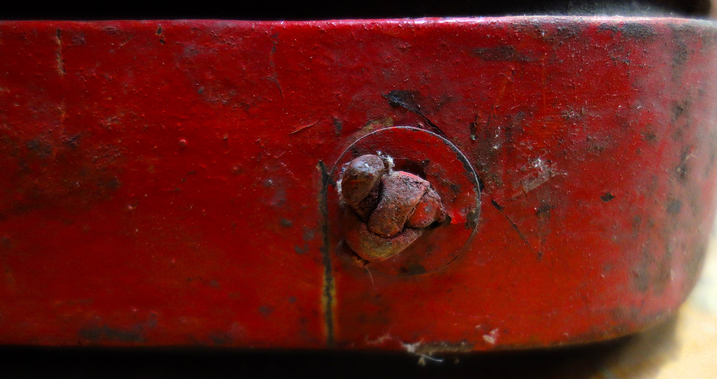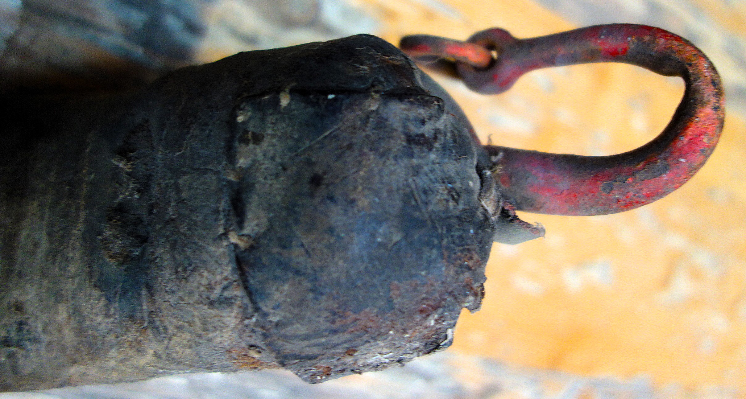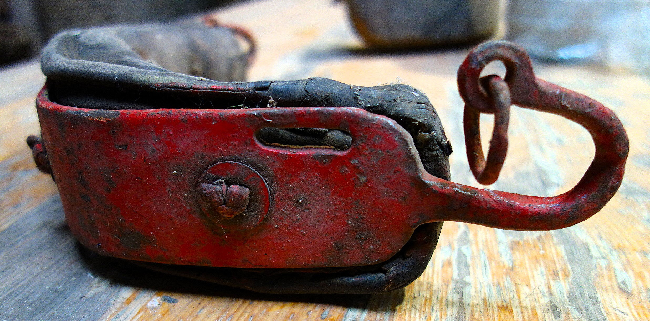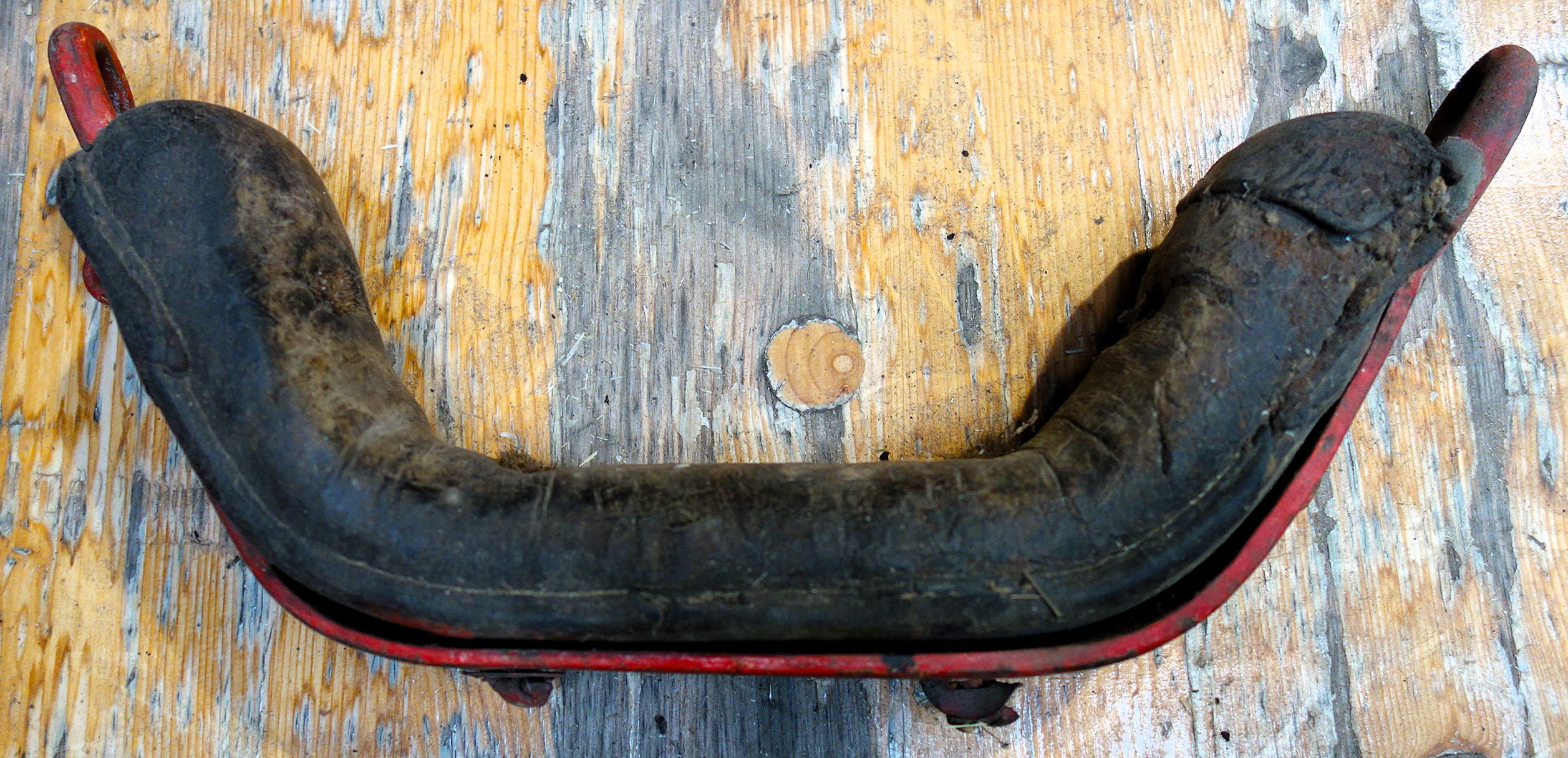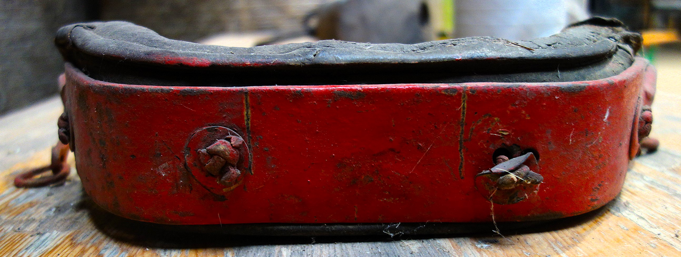 Rot gestrichenes Stirnjoch aus dem Freilichtlabor Lauresham in Lorsch. Auffällig (neben der Farbe) die aufgebogenen Enden des eisernen Jochbgens mit den relativ kleinen Ringen für die Zugaufnahme. Sollten diese für Knebel oder am Joch verbleibende Zugstränge gedacht sein, zeigen doch die dünnen Enden des Bogens Abnutzungserscheinungen, die für einen größeren Ring an den Sielen sprechen, der einfach darüber gesteckt wurde. Auch hier wird das lederne Polster durch kleinere Riemchen am metallenen Bogen festgeknotet. In den Schlitzen, die für die Hornriemen vorgesehen sind fehlen leider dieselben. Tierschonend die deutlich eckige Form des Jochs, darin spiegelt sich die Stirn eines Rindes wider und weist Ähnlichkeit zu den rheinland-pfälzischen Stirnjochen auf.