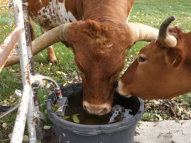 Ja, das glaubt ihr nicht? So ist es aber, und das obwohl unsere Chefkuh dem Landwirt immer wieder bestätigt hat, Longhorn hin oder her, wir kämen ohne Hörner auf die Welt. Meine hab ich daumennagelgroß mitgebracht, da weiß jeder gleich wo es lang geht! Wie ich da so im Stroh lieg und versuch zu Sinnen zu kommen packt mich doch gleich der Hunger. Das Aufstehen hab ich erst mal verschoben, aber glaubt mir, am Stroh nuckeln macht nicht wirklich satt. Gut, daß gleich ein Eimer warmer Milch serviert wurde.