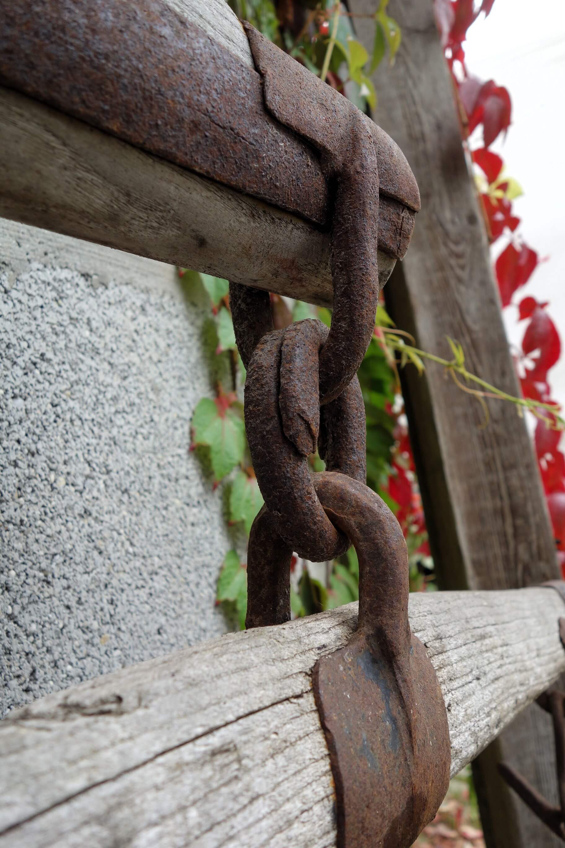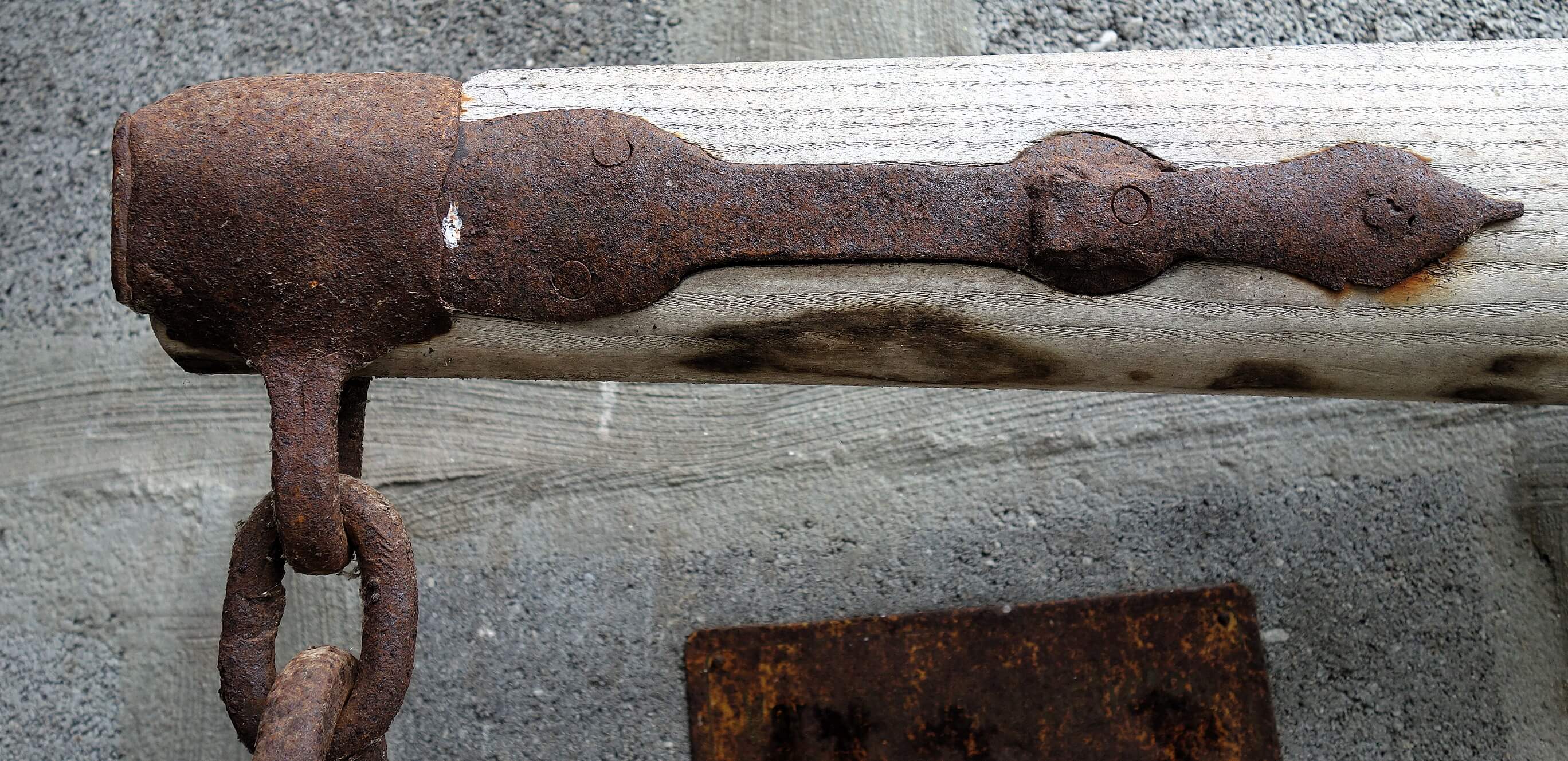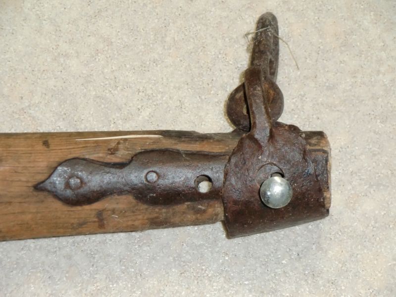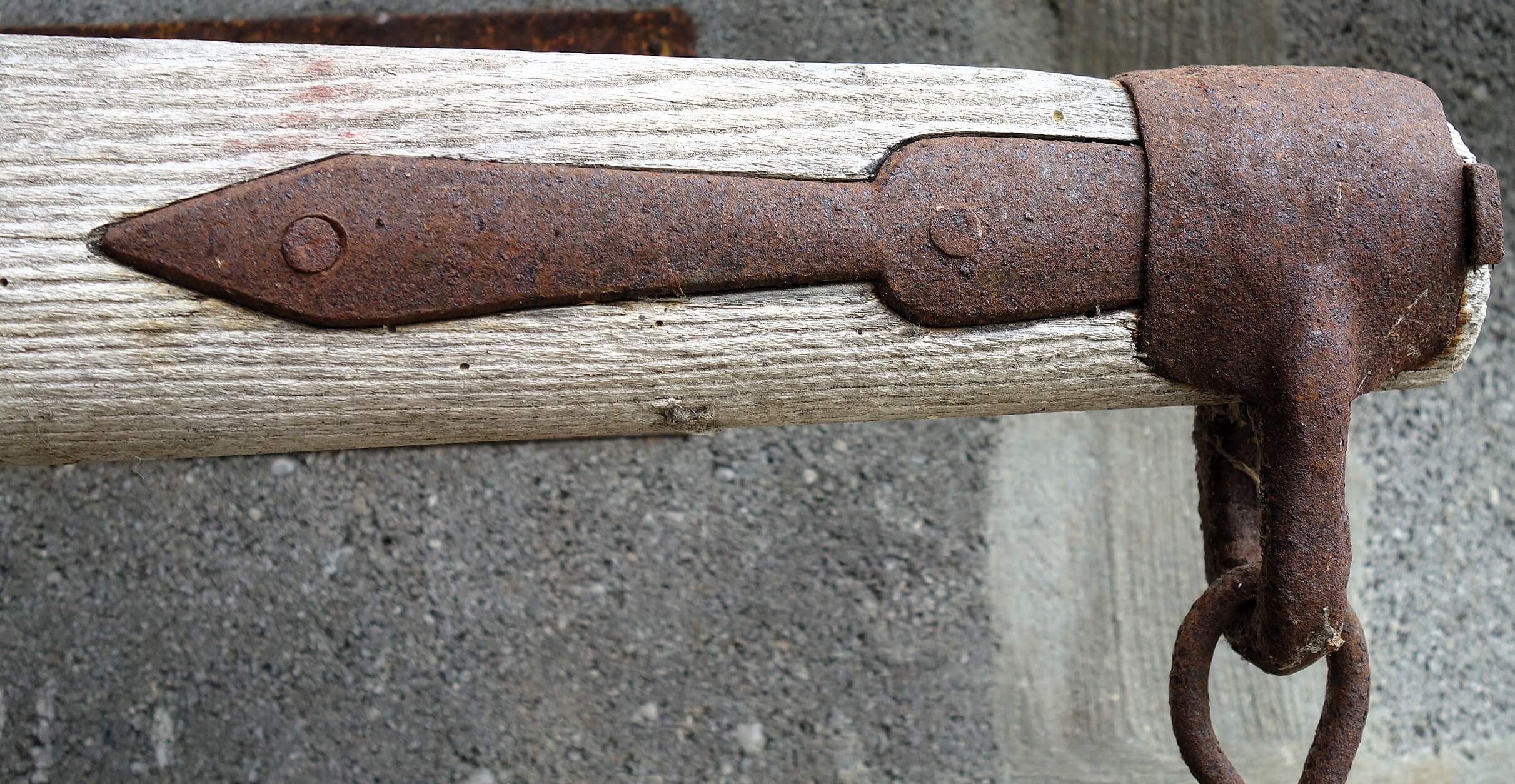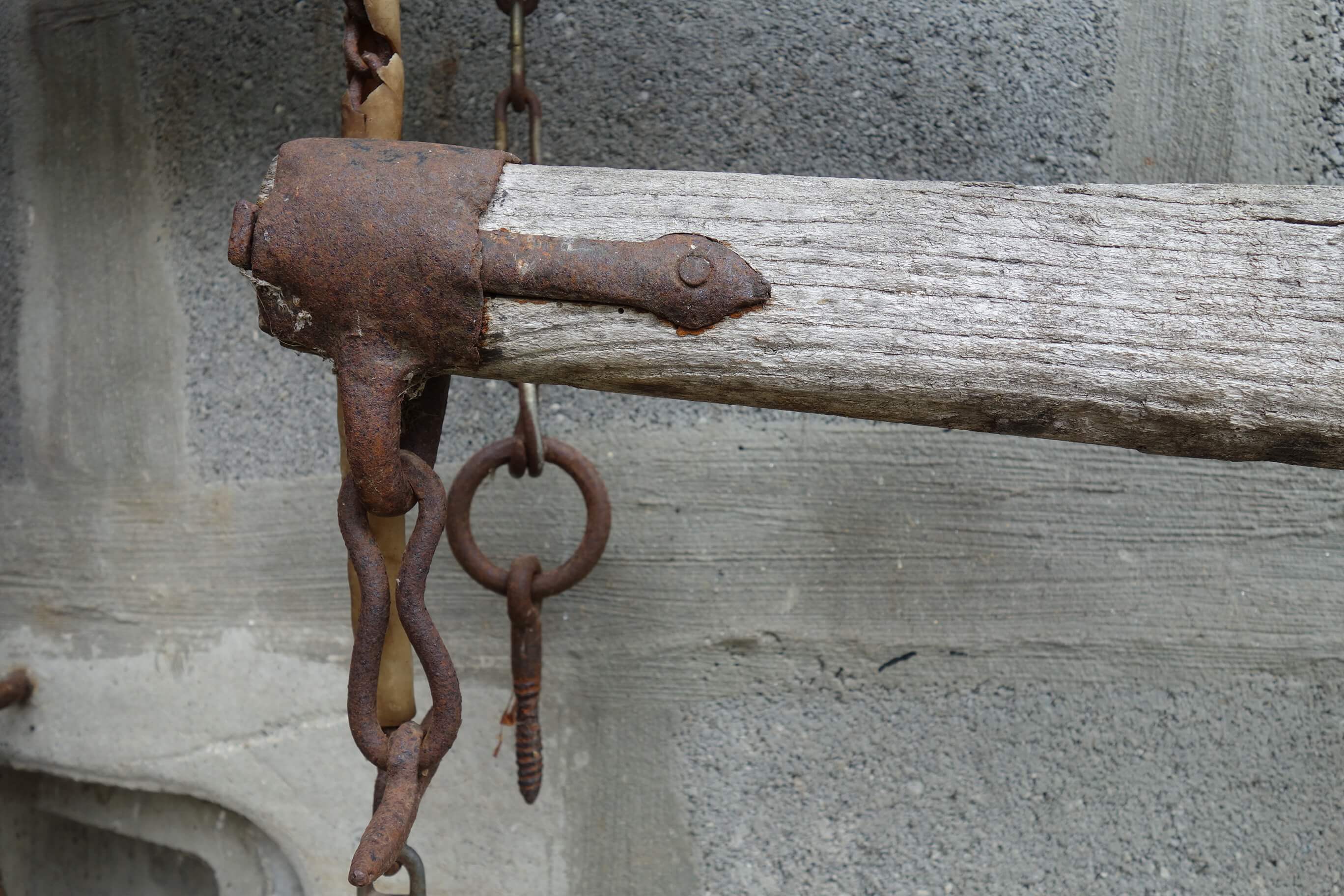 Ein altes, hölzernes, noch immer stabiles Wagscheit mit 2 fest angehängten Ortscheiten, eins im Originalzustand, eins augenscheinlich ersetzt.